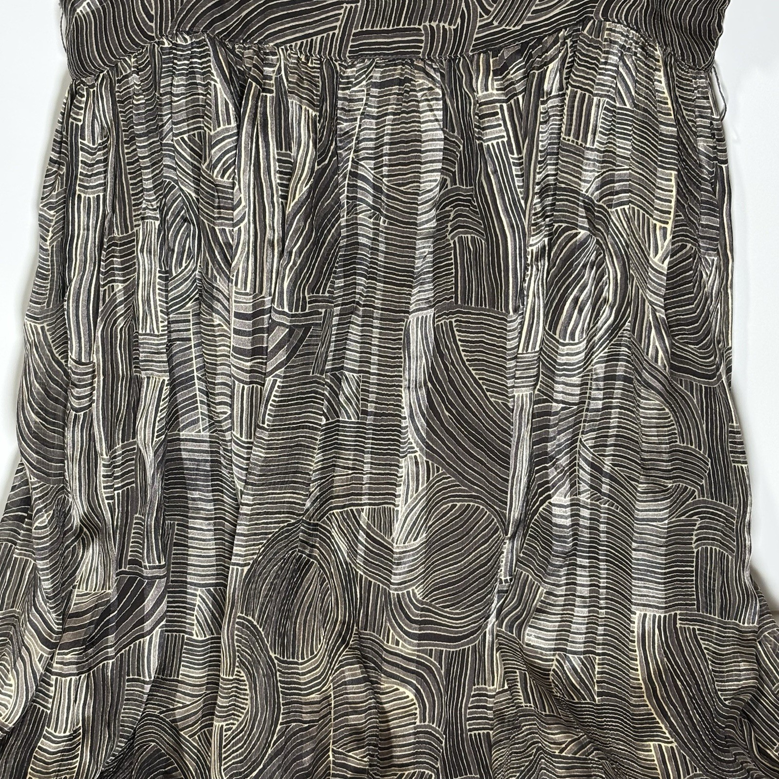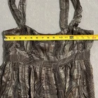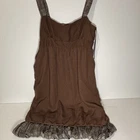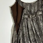 Elevate your wardrobe with the sophisticated charm of this women's size 8 silk sun dress by Ming Suit. Fashioned in a tasteful brown hue, the dress features a flattering sweetheart neckline and a knee-length cut that makes it perfect for a variety of occasions, from formal gatherings to weddings or cocktail parties. The dress's geometric pattern adds a modern twist to its classic silhouette, complemented by a chic bubble hem and peplum detailing that accentuates the high waist. Strap-style sleeves and a convenient side zip closure ensure a comfortable fit, while the lightweight silk shell and lining promise luxurious comfort for the discerning wearer. This garment, requiring dry clean only, is a testament to stylish simplicity, elegantly crafted to enhance your spring and summer ensembles. FLAWED: The front right strap and the inner brown liner need stitching repaired to return the dress back to great condition. Inner lining is torn on it's side. See photos, Final Sale!
