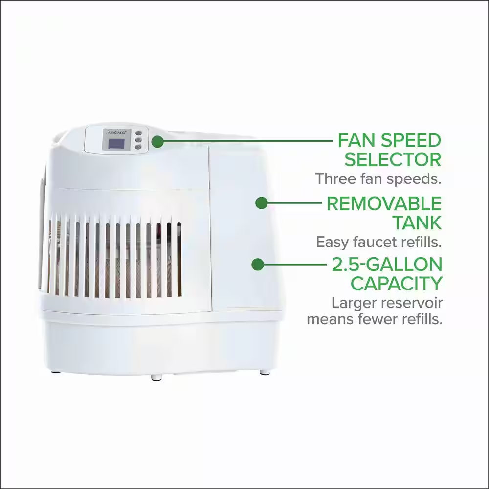 Cool mist evaporative humidifier Whole house humidifier for up to 2,600 square feet Uses AIRCARE MAF2 Super Wick® filter & AU5003PK (optional) This best-selling model's removable tank has a unique spring valve so there is no need for a cap - just press and fill. It has three fan speeds, plus an an auto setting that allows the fan to self-adjust according to the selected humidity level. The Mini-Console includes an adjustable humidistat, auto shutoff, refill indicator, and check filter indicator.