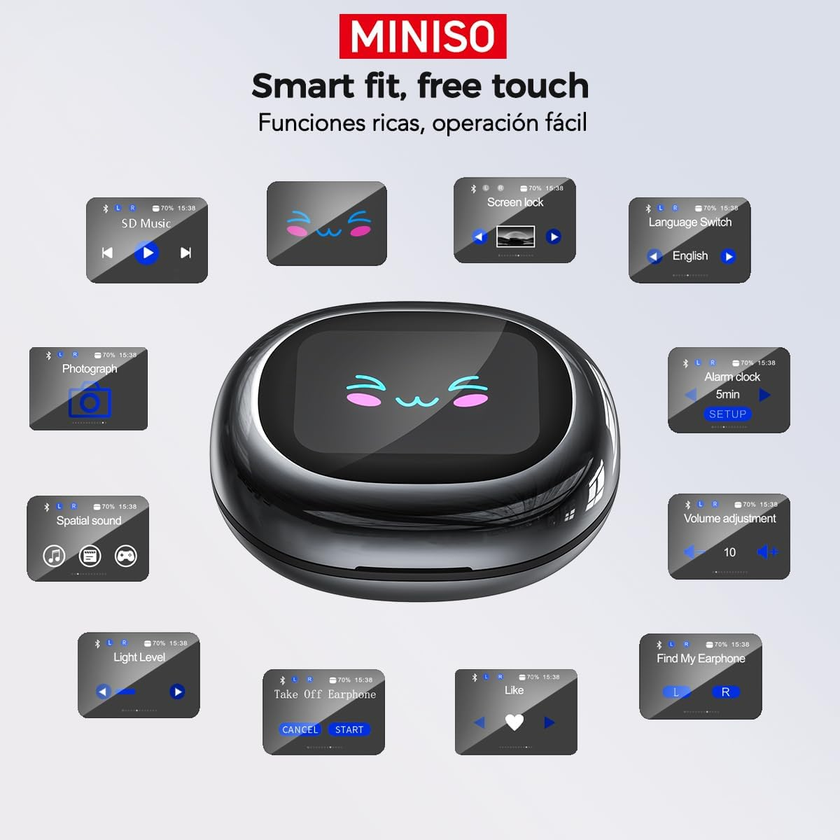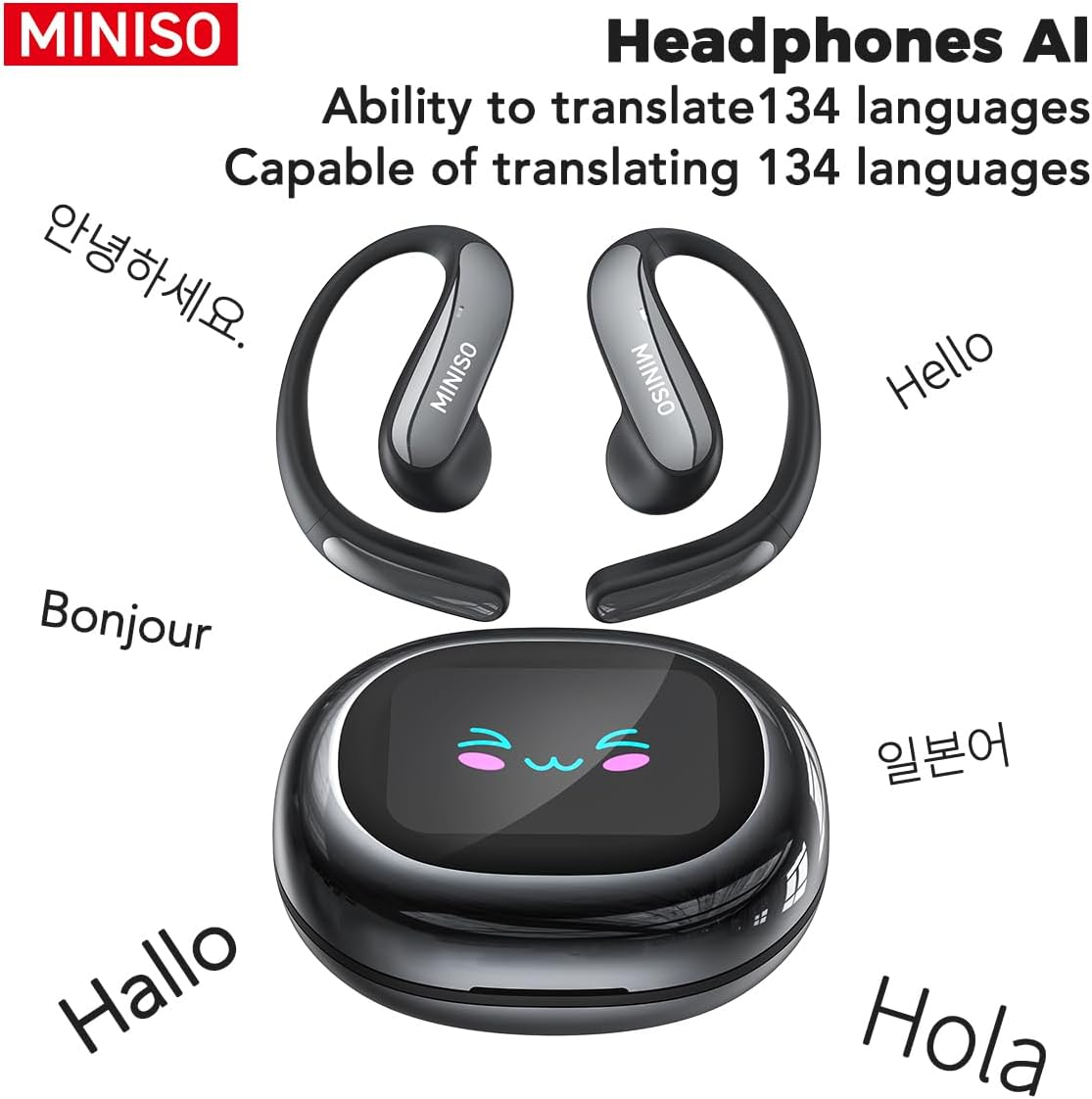 【About the MINISO MS203 Translator Headset】: The MINISO MS203 Translator Headset uses AI real-time translation technology to break down language barriers. Supporting up to 134 languages and accents, including English, Chinese, Spanish, French, German, and Russian, this translator headset provides real-time, two-way translation with less than 1-second latency and over 98% accuracy. Ideal for business meetings, international travel, or academic exchanges, this translator headset ensures smooth and natural real-time conversations anywhere in the world. 【LCD Touchscreen Control】: This language translator headset features an intuitive LCD color display that allows you to control over 15 functions directly from the headset, including music playback, TikTok likes, volume adjustment, EQ mode, language selection, alarm clock, stopwatch, SD card mode (you can listen to music directly without a phone by inserting an SD card), and even remote camera control. No phone required—all functions are accessible directly from your AI translator headset. 【Multiple Translation Modes】: The MINISO MS203 headset supports free talk mode, online translation mode, speakerphone mode, AI chat mode, photo translation, and voice memo mode. Compatible with the free AuraIntelli app, compatible with iOS and Android, these translating earbuds ensure effortless communication whether you're traveling, studying, working, or meeting new people. No more language hassles on your travels. 【3-in-1 Function】:Enjoy more than just translation. These translating earbuds combine real-time translation, high-quality music playback, and crystal-clear calls, making work and travel more efficient. The 13mm dynamic driver delivers crisp highs, deep bass, and balanced sound quality across all music genres. Each real-time translating earbud features a built-in microphone, ensuring your voice is always clear, whether you're in a meeting, on a call, or chatting. 【48-Hour Playtime and Type-C Fast Charging】:Enjoy up to 8 hours of continuous translation or music playback on a single charge, and a total of 48 hours using the charging case. These translating earbuds support Type-C fast charging, fully charging in just 1.5 hours, making them ideal for long trips and busy schedules. 【All-Day Comfort】: These translation earbuds feature a patented open, ergonomic design and skin-friendly materials. Weighing only 8.2 grams per earbud, they provide a secure and comfortable fit, perfect for exercise, commuting, and extended wear. They also offer enhanced noise isolation for clearer translations and calls. 【Bluetooth 6.0 and Smart Touch】: These translation earbuds are equipped with the latest Bluetooth 5.4 chip for faster pairing, more stable connections, and lower latency. Simple touch controls allow you to manage music, calls, and translations without picking up your phone, making them ideal for multitasking on the go. 【Note!!!】. You must first connect the earphones to your phone. 2. Then connect the earphones to the app on your phone. If you have any questions during use, please feel free to contact us and we will resolve the issue within 24 hours! Product description 1 HIFI Sound 2 Bluetooth 6.0 3 Multiple modes 4 SD Card Mode 5 LCD HD screen 1 Business meetings 2 Study exchanges 3 International travel 1 Packing list 2 Download App 3 Agile operations 4 Wear it correctly