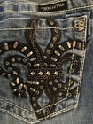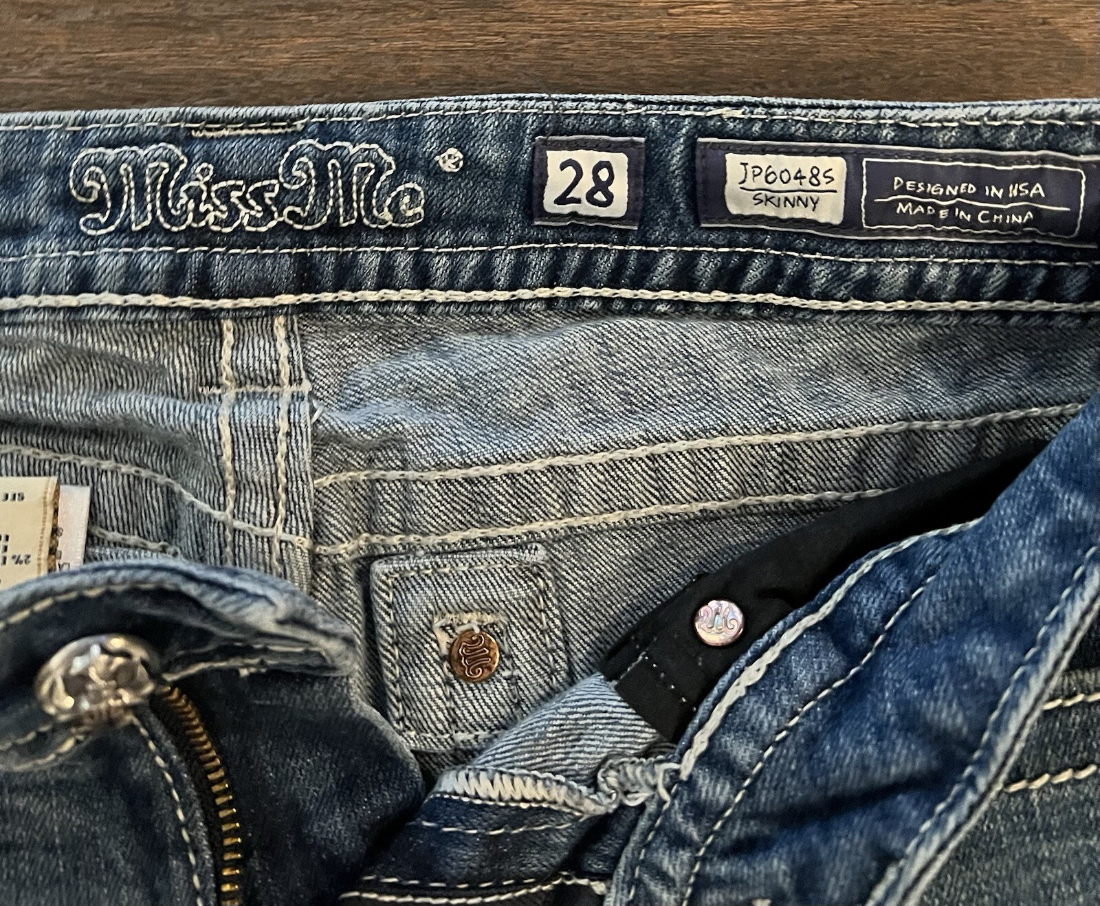 These Miss Me Skinny JP60485 jeans size 28 feature a solid pattern with embellished Fleur de Lis rear pockets and white stitching. The jeans have a mid-rise waist, a 5-pocket design with a coin pocket. Made of cotton/elastin fabric, they are machine washable and suitable for all seasons. The color is a medium blue wash.