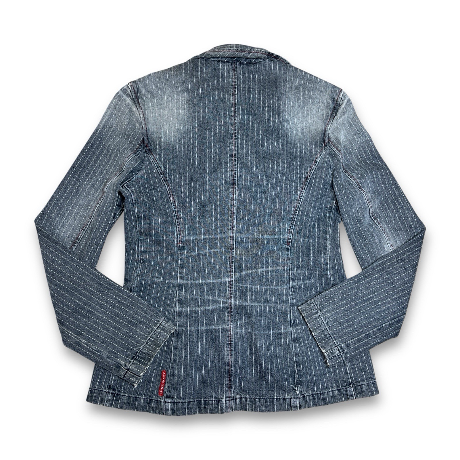 This vintage Miss Sixty denim blazer jacket in size M is a piece from Italy with a unique pinstriped design. Made from breathable cotton denim, this limited edition blazer features a collarless style, long sleeves, and pockets. The classic blue color, slim fit, and designer theme make it a stylish and versatile addition to any wardrobe for casual occasions in the summer, fall, and spring seasons. Machine washable and showcasing the brand's logo accents, this blazer is a timeless and fashionable statement piece for women looking for a blend of vintage charm and modern style. length 25.5” pit to pit 18” sleeve 24” shoulder 17”