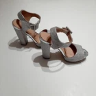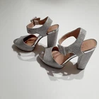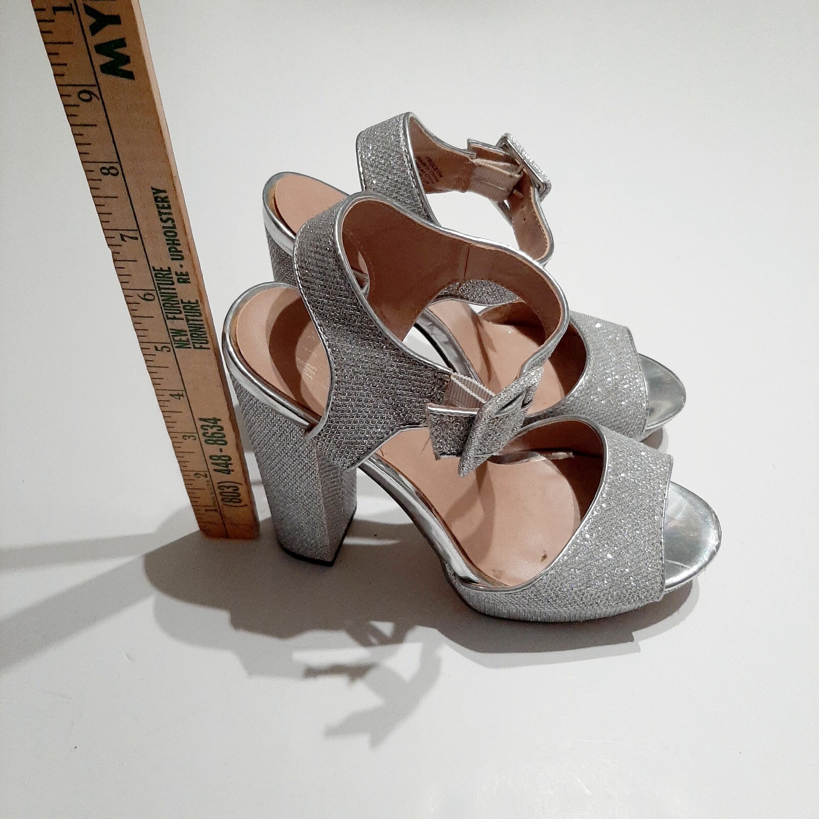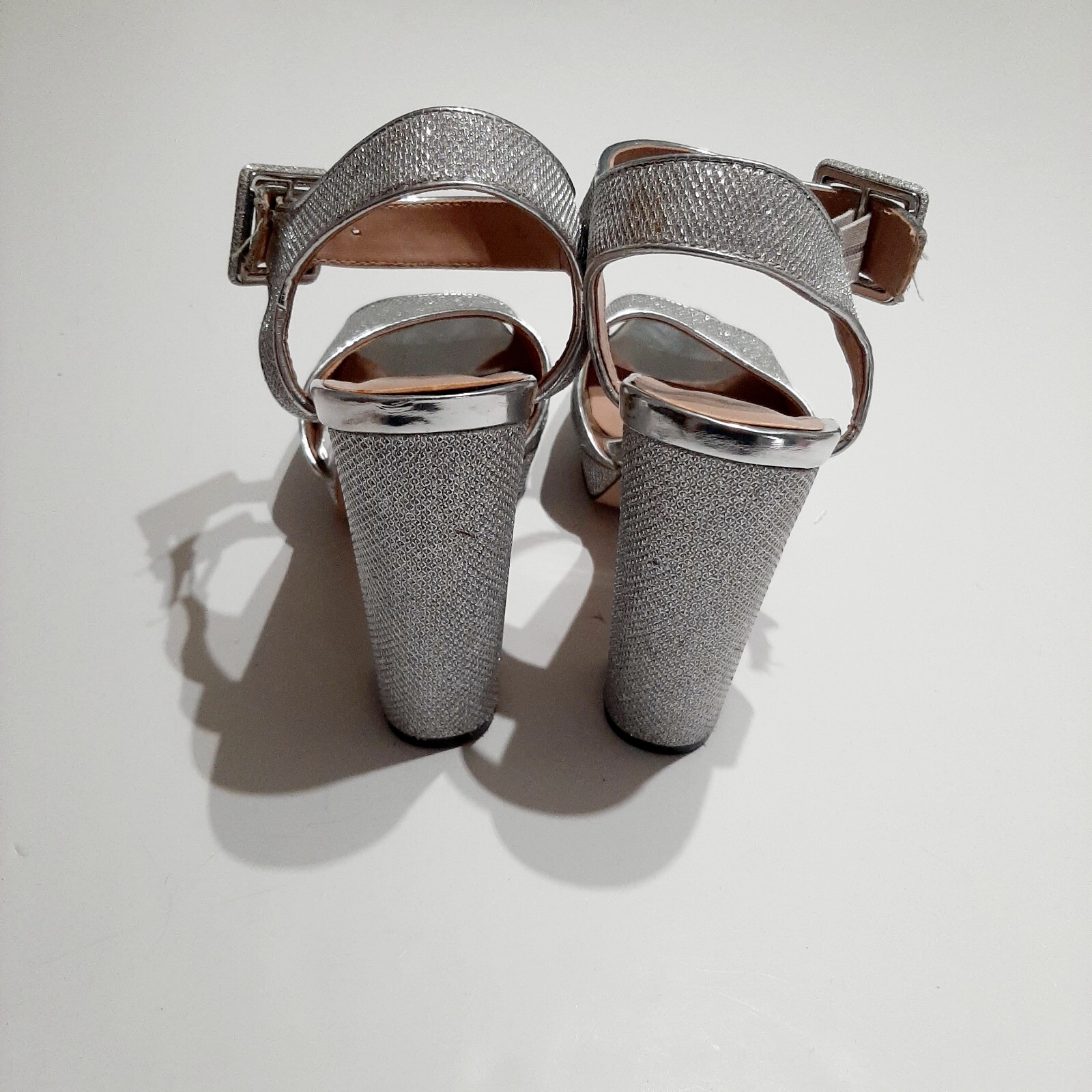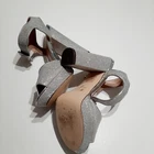 MIX No.6 Silver Glitter Rhinestone Size 8M Trendy, 5" Strappy, Platform Heels. Several circular darker colored spot on straps. Generously reduced to accomodate imperfections. See all photos.