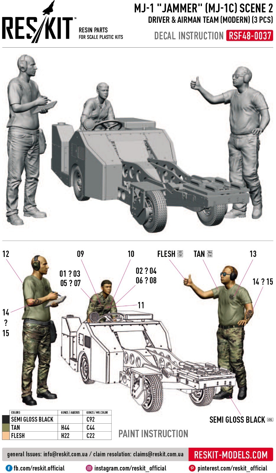 MJ-1 "Jammer" Driver & airman team (Modern) (MJ-1C) (scene 2) (3 pcs) (3D Printed) ResKit RSF48-0037 - for Plastic Model Kit Enhance Your Scale Models with ResKit | High-Quality Resin & 3D-Printed Accessories RESKIT - Accessories for Scale Plastic Kits Upgrade your scale model collection with high-quality resin parts from ResKit. Our Ukrainian-made parts are meticulously crafted to provide the most accurate and detailed representation of original components. Whether you're building aircraft, helicopters, military vehicles, or figures, ResKit has the perfect parts to enhance your project. Scale: 1/48 Manufacturer: RESKIT (Accessories for Scale Plastic Kits) Country/Region of Manufacture : Ukraine Condition : New in Box Category: Resin & 3D accessories Type of equipment : Aircraft Type of product: Figurines Recommended kit: Any ResKit is a Ukrainian manufacturer of high-quality resin parts and accessories for scale models . The products are distinguished by a high level of detail and accuracy, which allows modelers to create the most realistic models of military equipment, aviation and other objects. Key Features: Premium Quality: Our resin parts are made with the finest materials and precision engineering. Extreme Detail: Experience unparalleled detail and realism in your models. Wide Range: Choose from a vast selection of parts for various scales and subjects. Easy to Assemble: Our parts are designed for easy integration into your existing model kits. Superior quality! ResKit parts allow you to create a model with incredible detail. ---------------------------- >>> Visit our eBay store! <<< You will find everything you need at great prices. Scale model accessories are a wide range of parts, spares, and components that can help you make your model even more realistic and detailed. In our catalog, you will find everything you need to assemble and repair model cars, airplanes, ships, tanks, and weapons. Our accessories are made from high-quality materials and meet all standards. We offer a wide range of models and sizes so you can find what you need. Buy scale model accessories in our store and make your model even more unique!