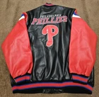 MLB Genuine Merchandise - PHILADELPHIA PHILLIES - Men's Leather JACKET - 2XL. Awesome jacket in good condition (minus the minor scratch See Photos). Perfect for any Phillies fan and ready to be worn to play ball or wear to your next game. GO PHILS!!!! Don't miss