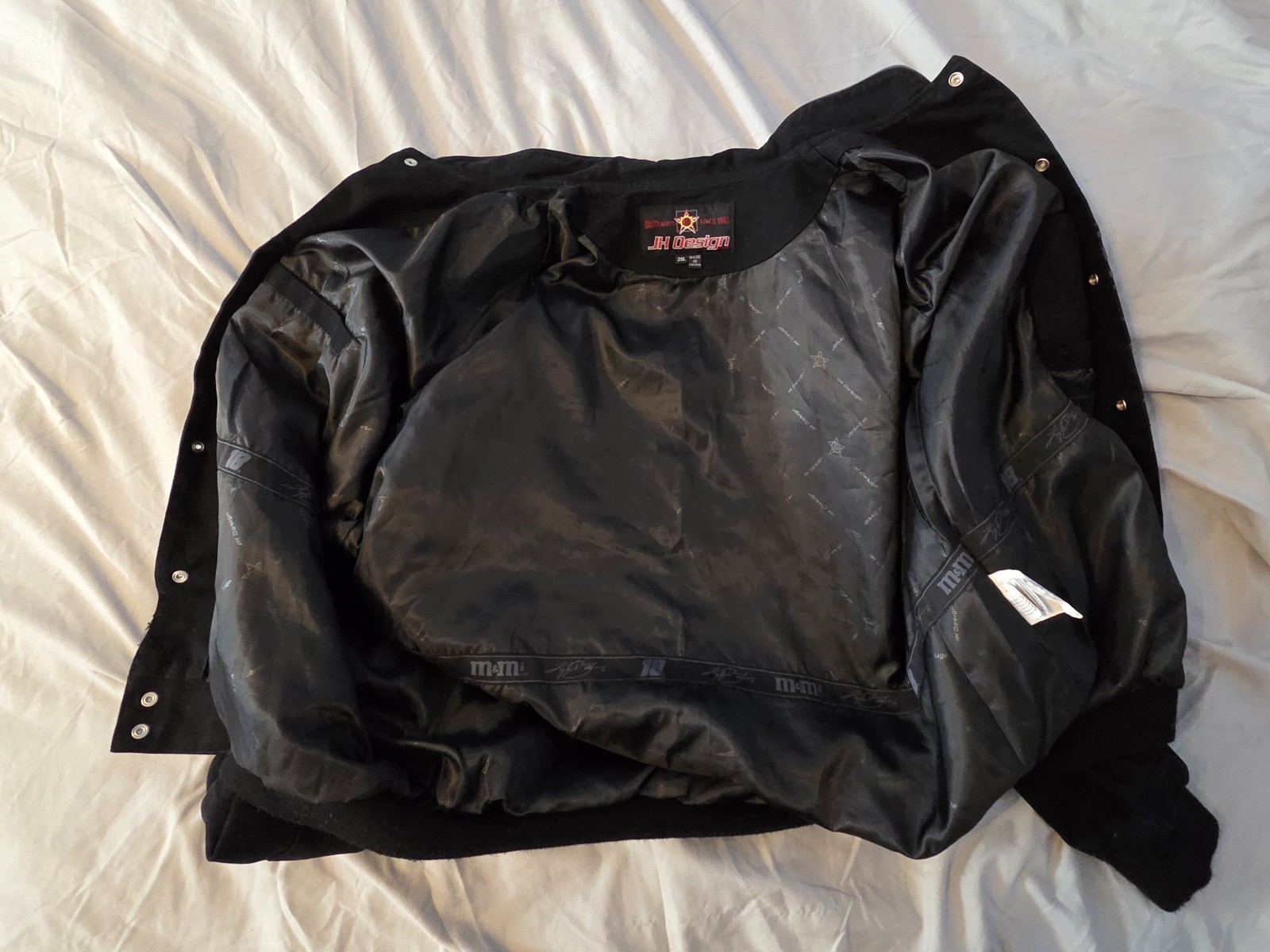 The M&M Racing Jacket #18 in Black Vintage NASCAR design by JH Designs is a rare and highly sought-after collectible for fans of Kyle Busch and the Joe Gibbs Racing team. Made in China, this officially licensed jacket showcases the driver's number and sponsors in gray against black in a stylish and unique design. The large XXL size makes it perfect for male NASCAR enthusiasts looking to show their support for the sport and their favorite driver in a standout piece of fan apparel. Other sponsors: Interstate Batteries Doosan Infracore Food Lion Shewing Williams Goodyear Sprint Cub Series Toyota NOS Energy Drinks Doublemint gum Pedigree Dog Food Snickers Siemens Sunoco Gillette