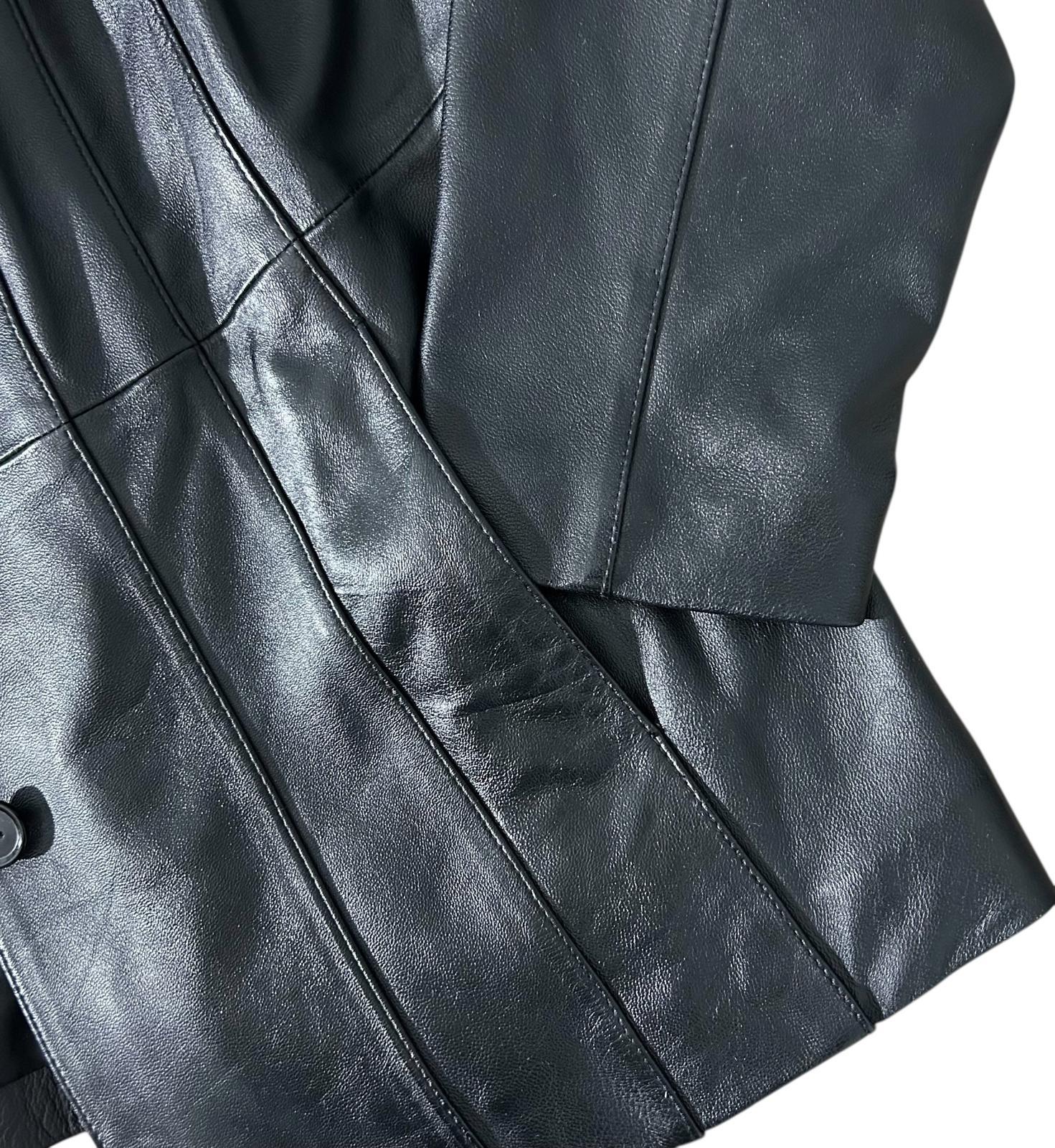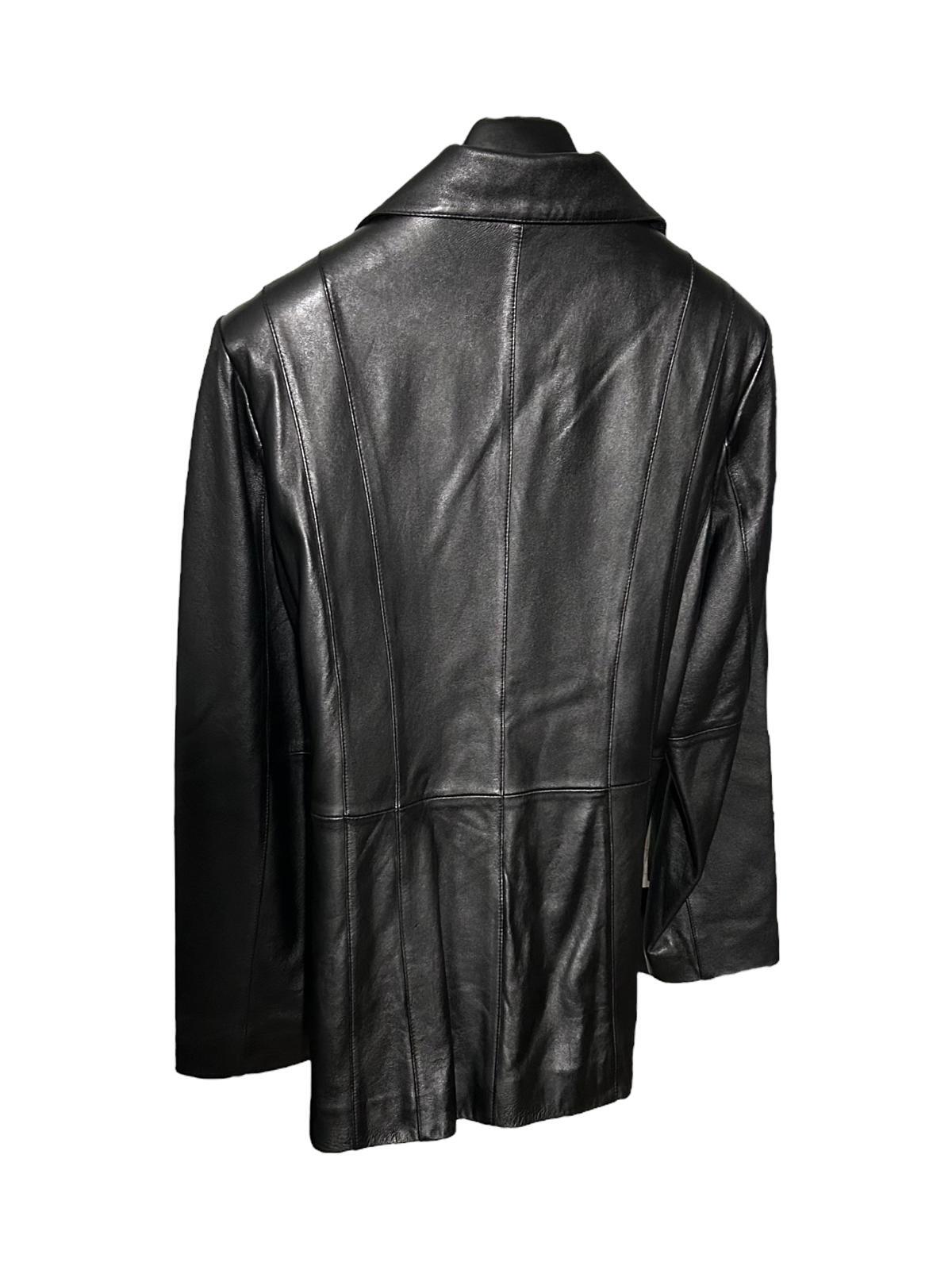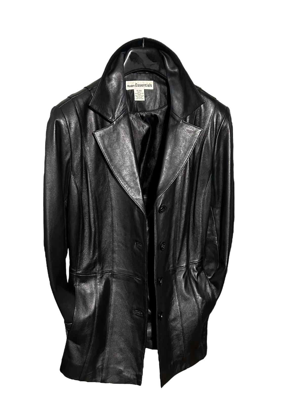 Engage your inner chic on cool days and nights in this Vintage Black Leather Button-Front Coat Jacket by MODERN ESSENTIALS. Crafted in a luxurious 100% Genuine Leather, this timeless classic features a Button Front Closure, Side Pockets, and a comfy Silk-like Lining. Perfect for virtually any occasion, this Black beauty will be in your closet for years to come...Available in a Women's XL-18 (see measurements below). Excellent Condition - No Flaws - Rarely Worn. Original Retail: $225 --- SAME DAY SHIPPING for Orders Received by 3:30 PM EST --- • Condition: Excellent Condition - No Flaws • Size: Women's XL - 18 • Color: Black • Shell Fabric: 100% Genuine Leather • Lining: Polyester • Measurements (Laying Flat): Chest (Pit to Pit): 20.5" Sleeve Length (shoulder seam to end of Sleeve): 24.5" Length (Top of back collar to bottom of hem): 30.5"