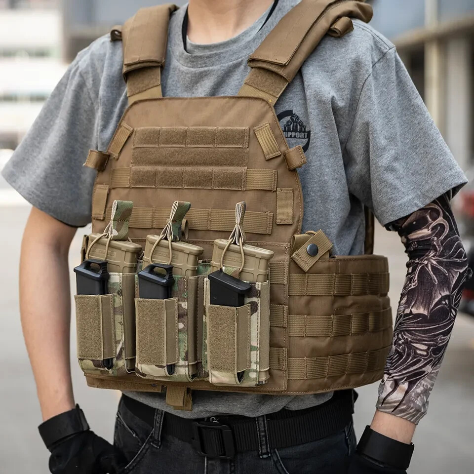 ********100% Veteran Owned Business*******Ships next day from Texas*********All items in stock This is a triple magazine pouch made from 1050 denier nylon with MOLLE attachment. Holds three 556/223 rifle magazines and three pistol magazines. Fits most standard pistol magazines. Color is Black and matches the camoflage pattern on our Combat Ready Tactical Vest perfectly. Order with a tactical vest for a $5 rebate!