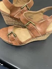 This is a pair of Mossimo Supply Co brown ankle strap sandals with a cork heel and studded accents. The sandals feature a strappy design with a buckle closure and an ultra high wedge heel. They are made of faux leather and are in a size 6.5.