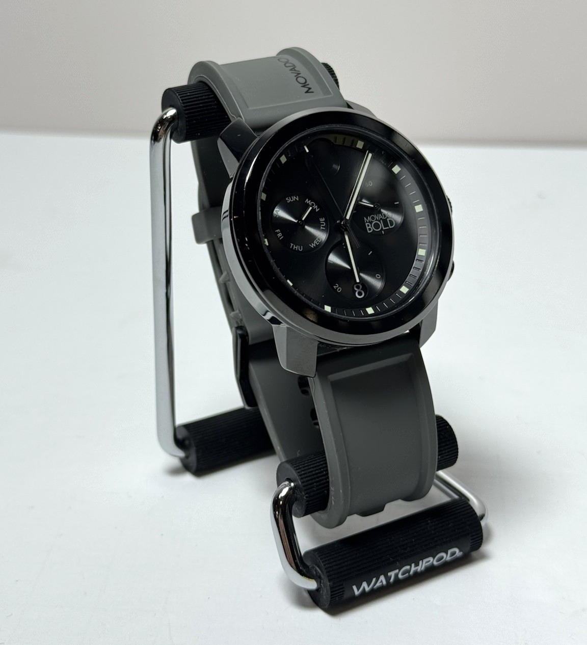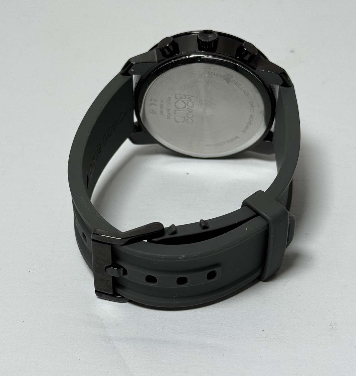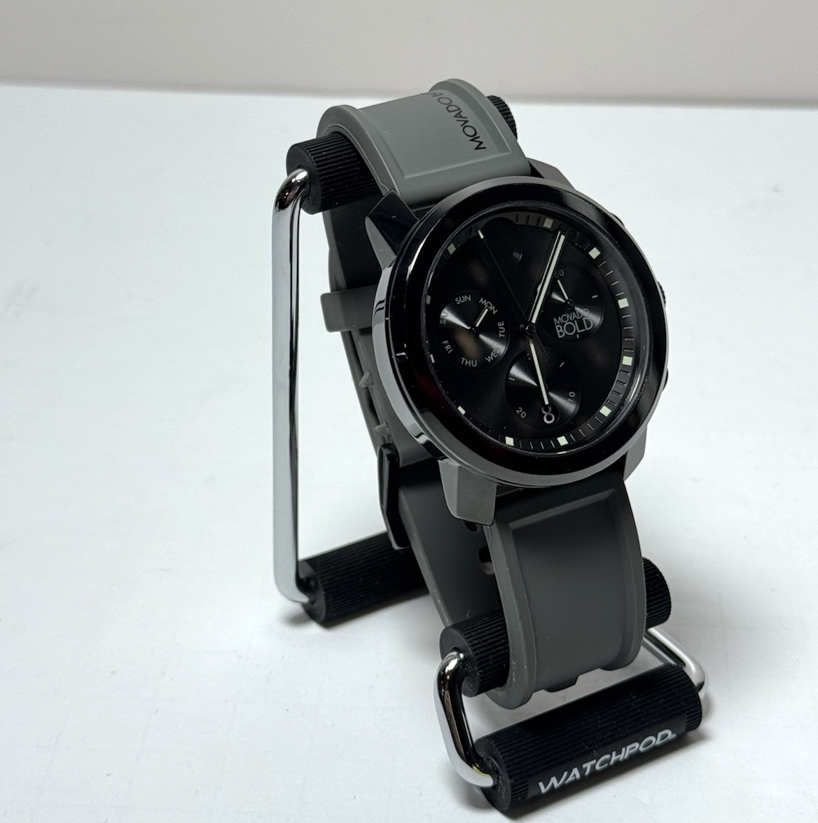 Preowned MOVADO TREND PROPEL BLACK CHRONOGRAPH 44mm with Gray Strap Good working and cosmetic condition. Has been fully tested and ready to use. Shows signs of minor use. No scratches on the case. Comes as pictured. No original box included.