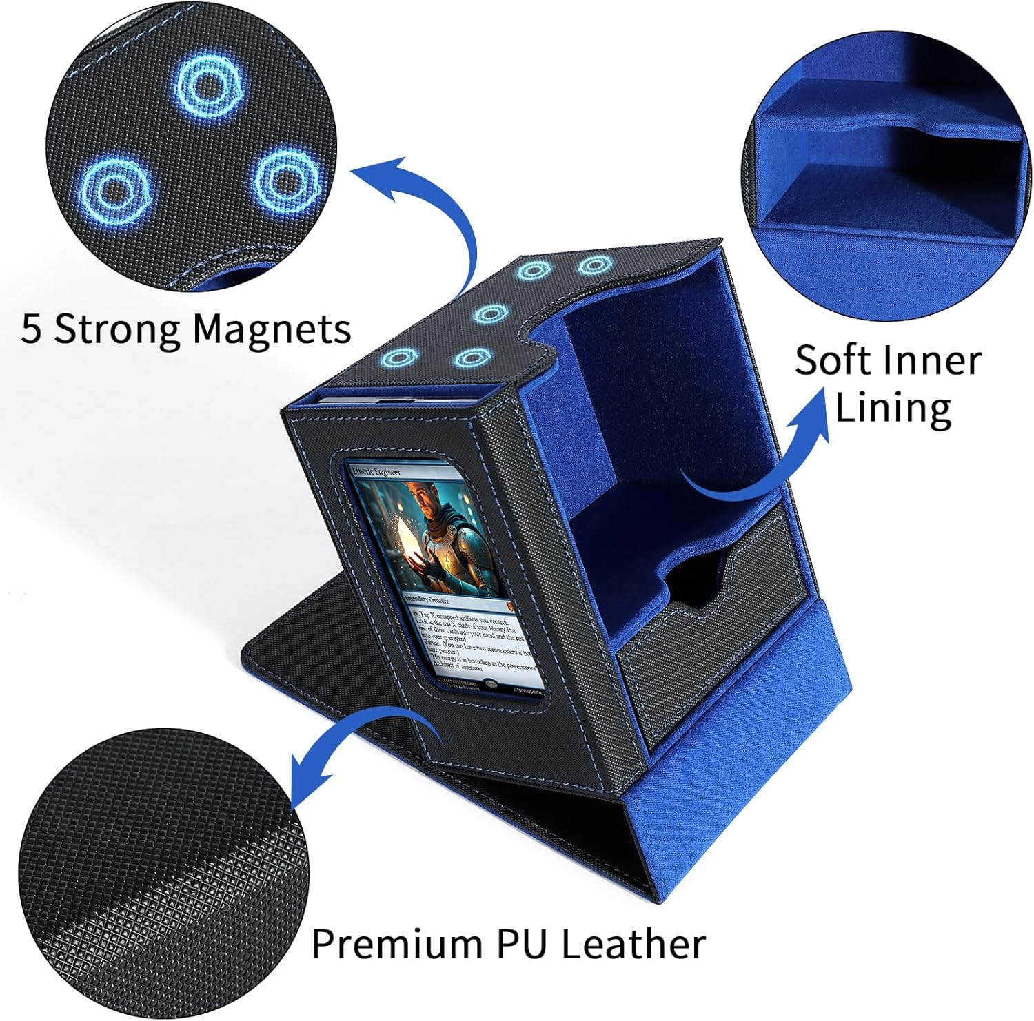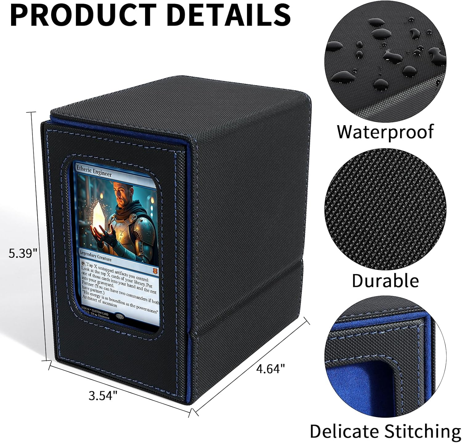 [Tailored for Commander Players] Specifically designed for Commander (EDH) players, this innovative mtg deck box offers exceptional protection and display for your Commander deck. The dedicated card holder securely stores your Commander card and proudly displays it in a separate slot. Additionally, the side window allows for quick identification, making it easy to find the deck you need [Versatile & Practical] This is not just a commander deck box; it also functions as a deck stand. The lid of the box doubles as a support, featuring a U-shaped opening that allows for easy card retrieval during gameplay. Whether for preparation or intense sessions, it offers ultimate convenience and security [Large Capacity] This card deck box can hold up to 100 double-sleeved cards or over 120 single-sleeved cards. It also includes a large dice tray that can store up to 15 D20 polyhedral dice, keeping your cards and accessories organized and easily accessible, providing an all-in-one solution for your needs [Robust Protection] The mtg deck box is crafted from high-quality PU leather for superior shock protection. Its soft microfiber lining prevents card scratches, and multiple strong magnets ensure the box stays securely closed, even during transport, keeping your deck safe and intact [Bonus Inclusions] Each MTG commander deck box comes with 2 card dividers, 1 dice tray, and 35pt card holder. Whether you're an MTG, PTCG, or other TCG enthusiast, this deck box is the perfect choice for storing and protecting your precious cards Product Description