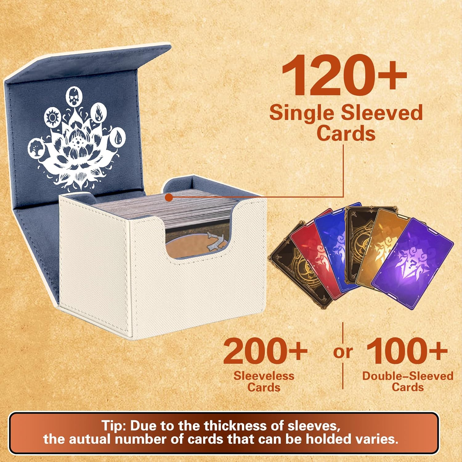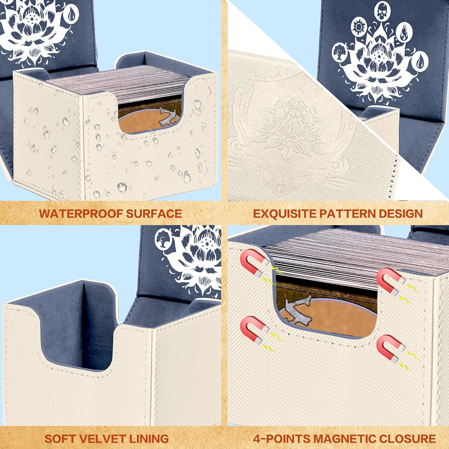 Faux Leather Exquisite Graphic Design: This PROMAXIBINDER MTG commander deck box, inspired by the classic Black Lotus card and combined with the five basic elements of MTG games, has redesigned the cover, to add a touch of personalization and flair. We will be committed to providing players with better designs. Premium Quality & Durable: The PROMAXIBINDER MTG deck box is a double-layer construction with an upgraded plasticized, waterproof PU leather outer layer and a soft, high-grade microfiber inner layer that protects the cards inside the box. This ensures the safety of your valuable MTG cards, protecting them from wear, tear, and environmental factors. Strong Magnet & U-Shaped Design: Precise and tight stitching and 8 powerful magnets ensure that the MTG commander deck box always closes tightly. The double-sided, wide-mouth U-shaped design makes it easy to remove all playing cards at once, even when the MTG deck box is full. The perfect design allows you to place and remove playing cards easily and without any obstruction. High-Cost Performance Storage Capacity: The MTG deck box size - 3.1*3.9*4.1 inches, holds up to 120 standard-size gaming cards with single sleeve or 200 un-sleeved cards. Offers more room for your cards. This deck box is suitable for double-sleeved, KMC inners, Dragon Shield outers, and commander deck perfectly. Also compatible with Magic The Gathering MTG, YuGiOh!, and Cardfight!! Vanguard, Duel Masters, etc, a variety of TCG/CCG/LCG & other collectible cards. What You Get: PROMAXIBINDER service:1-year warranty and 7/24 service for our valued customer as a satisfactory result. If you have any questions, please feel free to contact us at any time. We are more than happy to assist you at any time. Product Description