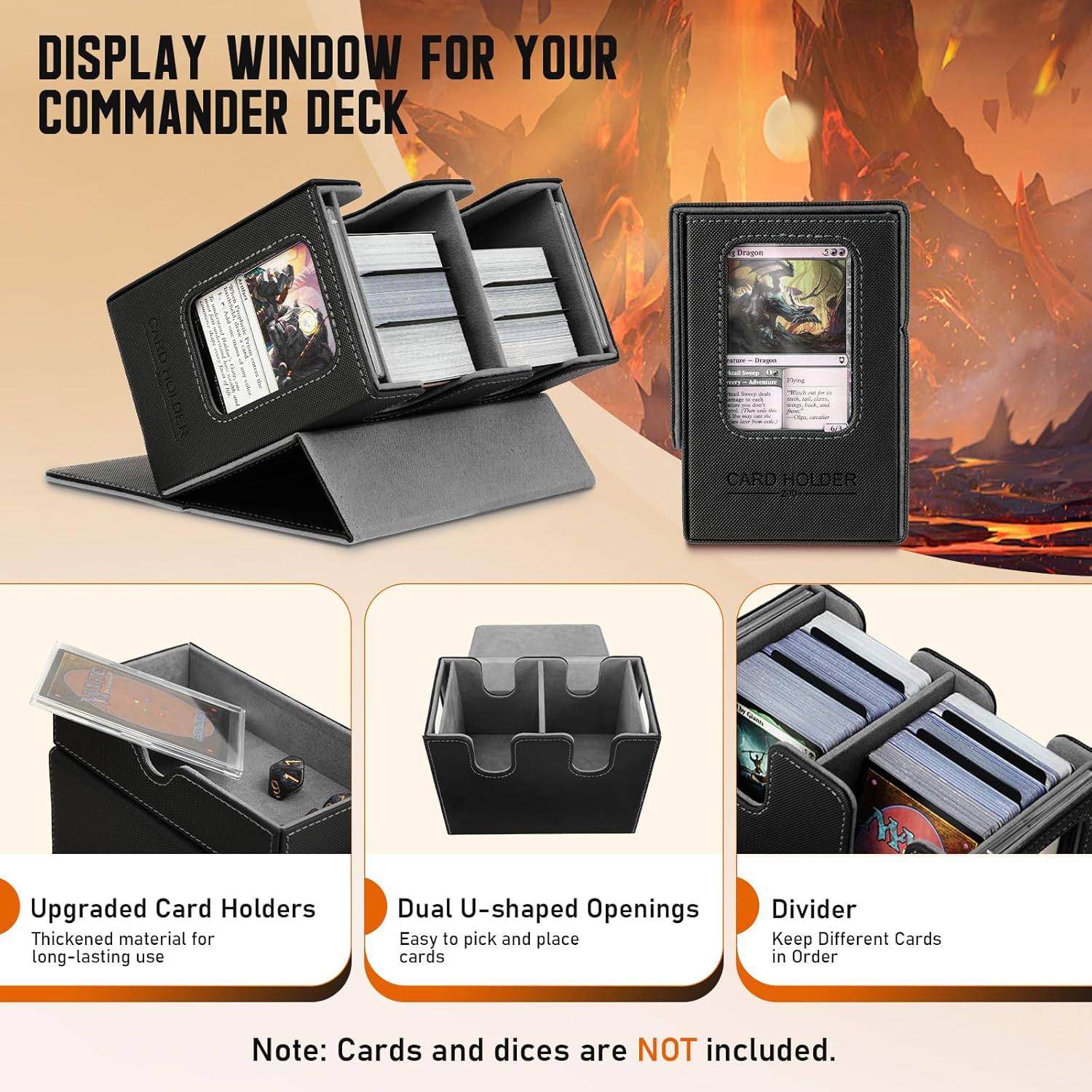 This MTG Deck Box is a game-changer! It holds tons of cards, whether sleeved or unsleeved, and the U-shaped opening makes accessing them mid-game a breeze. Love the hidden dice drawer—keeps everything secure but easy to grab. The commander display window adds a stylish touch, and the whole case feels durable and well-designed. Perfect for keeping your collection organized while looking awesome on the table!
