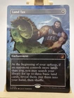 This rare and highly sought-after Magic: The Gathering card is sure to be a valuable addition to your collection. Featuring the stunning artwork of Jintetsu, this White enchantment card is from the Wilds of Eldraine Enchanting Tales set. With a Confetti Foil finish and borderless design, it is a true gem for any MTG fan. The Land Tax card is a Mythic rarity and has a stock number of 198968. It is a standard size card made from high-quality card stock material. Perfect for players aged 13 and above, this non-foil card has a mana cost of W and a card number of 0086. Don't miss your chance to own this incredible card from Wizards of the Coast.