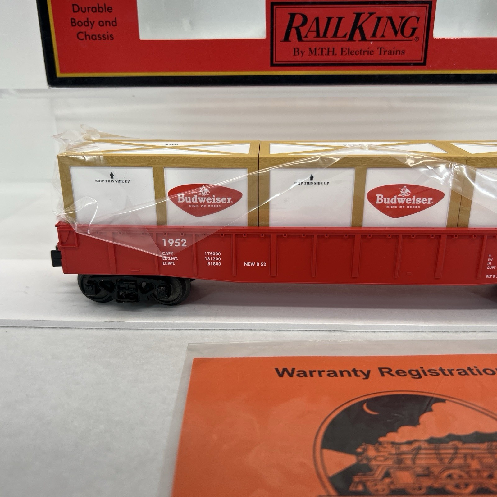 MTH RAILKING #1952 ANHEUSER BUSCH BUDWEISER GONDOLA CAR WITH CRATES O GAUGE 3 RAIL 30-72049 COMES IN ORIGINAL BOX. NEW. WILL BE PACKED TO ENSURE SAFE DELIVERY! Winning US bidder receives FREE SHIPPING USPS Priority UPS ! Canada Priority shipping is available . All other countries please email for a mailing quote. Thanks for looking! I ship everyday!!!!