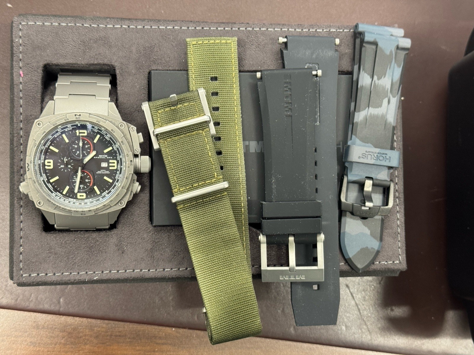 The MTM Special Ops Cobra 47 Titanium Chronograph is a high-quality wristwatch designed for men with a stylish and functional design. This limited edition timepiece features a gray bezel, black carbon fiber dial, and a durable titanium case with a grey sandblasted finish. The watch is water-resistant up to 200 meters and comes with a NATO strap for added versatility. With features like a screwdown crown, luminous hands, date indicator, and chronograph, this watch is ideal for pilots and aviation enthusiasts. The 47mm case size adds a bold touch to the overall design, making it a standout piece in any watch collection. Comes with OD MTM Nato strap, MTM titanium bracelet, MTM black rubber strap, and a Horus camo rubber strap. Worn maybe 6 times.