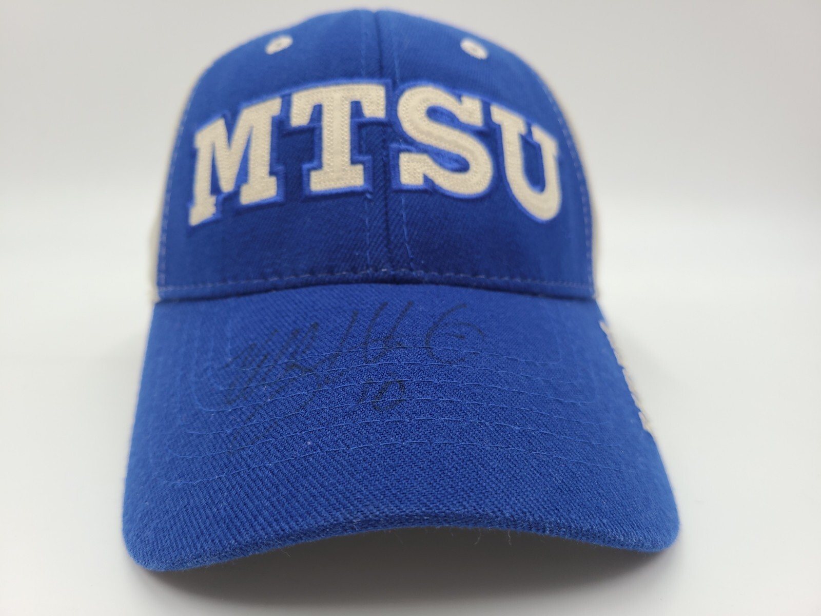I can't identify the autograph. Has some stains underneath the brim as seen in photos. Middle Tennessee State MTSU Blue Raiders Flex Fitted OSFA Hat Cap Men Women NCAA. EACH ADDITIONAL HAT PURCHASED IS ONLY $1 ADDED SHIPPING!