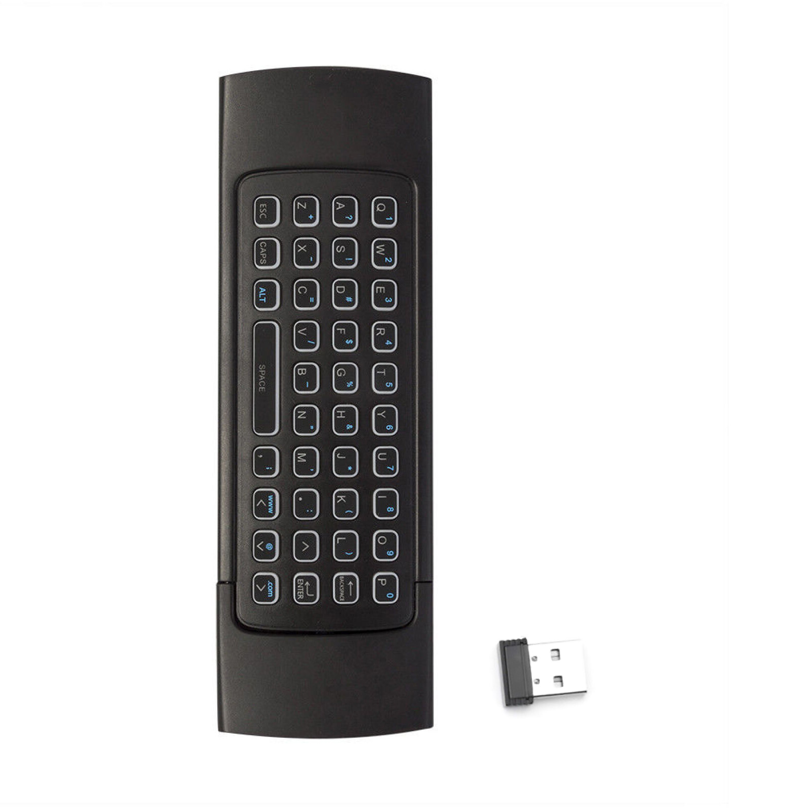 NEW-00023 Remote Control MX3 Backlight Air Mouse 2.4G RF Keyboard For KODI TV BOX PC F PRODUCT DESCRIPTION Features: Full Keyboard and TV Remote \Motion Sensor Allows Mouse to be Controlled by Waving the Remote Frequency Range: 2.4~2.4835GHz Upgradeable Function for Motion Gaming 2.4G Transmission up to 5m Effective Batter Saver, turn into Sleep Mode for 20 Seconds, Inaction <6uA Plug-and-play Function,Compatible with USB1.1 and USB2.0<6uA Support system: For Windows 2000/XP/Vista, For Windows CE, for Windows 7, for Android, for Linux (Debian-3.1. Redhat-9.0 Ubuntu-8.10 Fedora-7.0 tested), for Android 4.0 Specifications: Control Transmission: 2.4G RF Radio Frequency Technology Keys Quantity: 81 Keys Battery Type: AAAx2 (No include battery) Material: Plastic + Silicone (Backlight / Backlit Consumpation : <10MA Size: 172*52*19mm Sensor: 3 Axir Gyroscope + 3 Axir Accelerator Use Distance: >5M Color: Black Sun key: Open / Close Backlight How to use IR learning IR Learn Keys:(four color keys without any mark,at the end of the keyboard) Step 1: please put the original remote and MX3 keyboard together with the front part in inverse Step 2: please press the MX3 keyboard's "Power" button without release until the red led change from quick flashing to slowflashing Step 3: please press the key that need to be learn in original remote quickly after the red led becomes slow flashing. Then the red led will be on and not flashing Step 4: please press the key that learn the remote in MX3 keyboard. Please repeat the steps to learn all (Start fron step 1 to revise or start a new set up) Package Content: 1* MX3 backlight Air Mouse (Not include battery) Shipping Contact Us Our products have been sent to the US warehouse. All items will be shipped via WINIT CORPORATION. In 2-5 working days, you will receive your items. Thank you and have a nice day. If you have any question about us or items, please contact us, we will reply it as soon as possible. Shipping Our products have been sent to the US warehouse. All items will be shipped via WINIT CORPORATION. In 2-5 working days, you will receive your items. Thank you and have a nice day. Contact Us If you have any question about us or items, please contact us, we will reply it as soon as possible. PaymentShippingReturn policyAbout usContact us Copyright © - Tongtool All rights reserved | Design:Tongtool