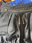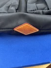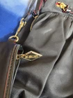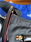 This MZ Wallace crossbody bag is medium-sized with a solid black exterior made of nylon and leather trim. It features a zip closure, gold hardware, and a fushia pink lining. The adjustable crossbody strap has a drop length of 20-28 inches. The bag includes inner and outer pockets, a key clip, and comes with small pouch. Ideal for travel, parties, or casual use. Dust bag included.