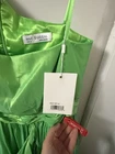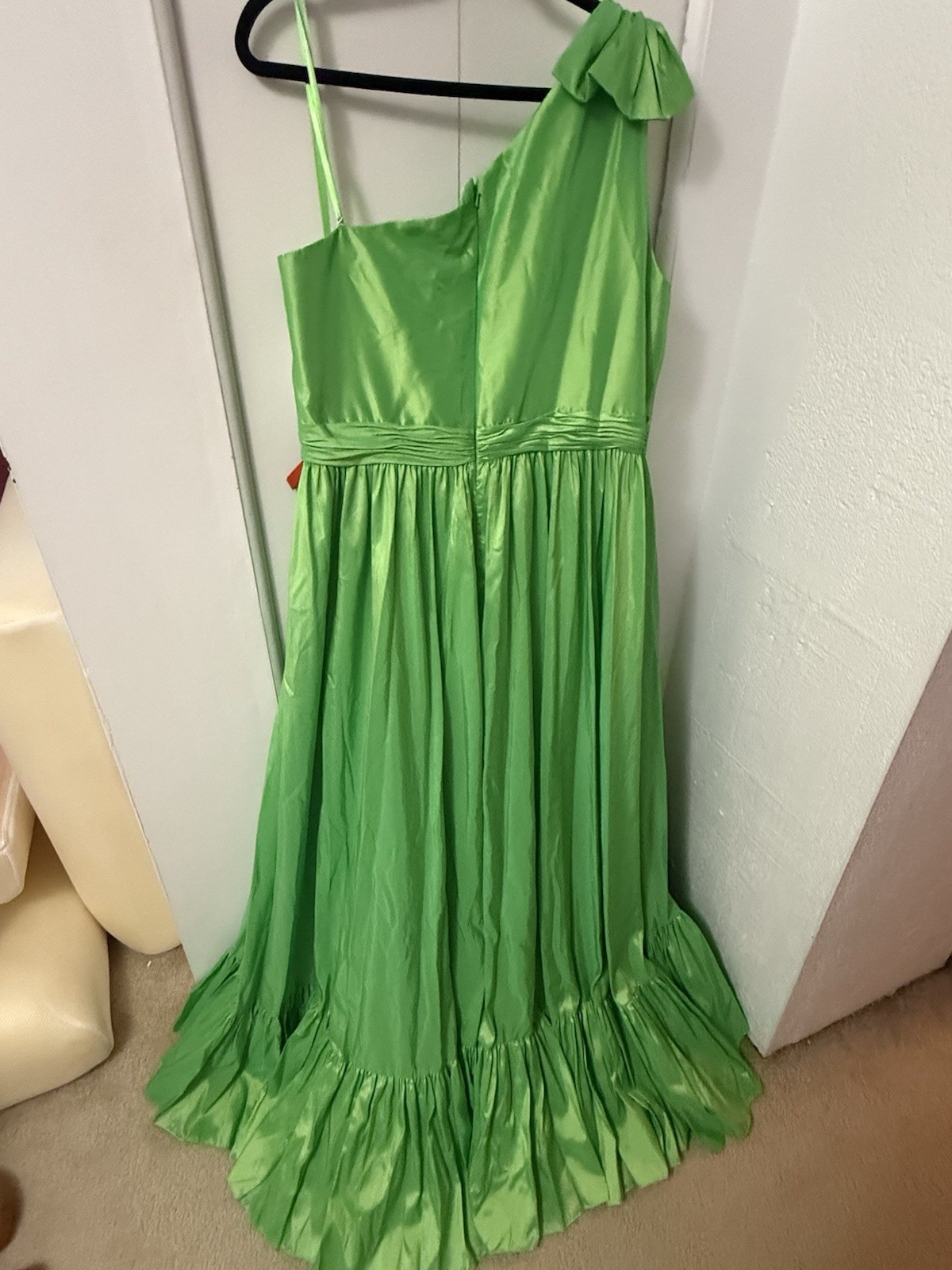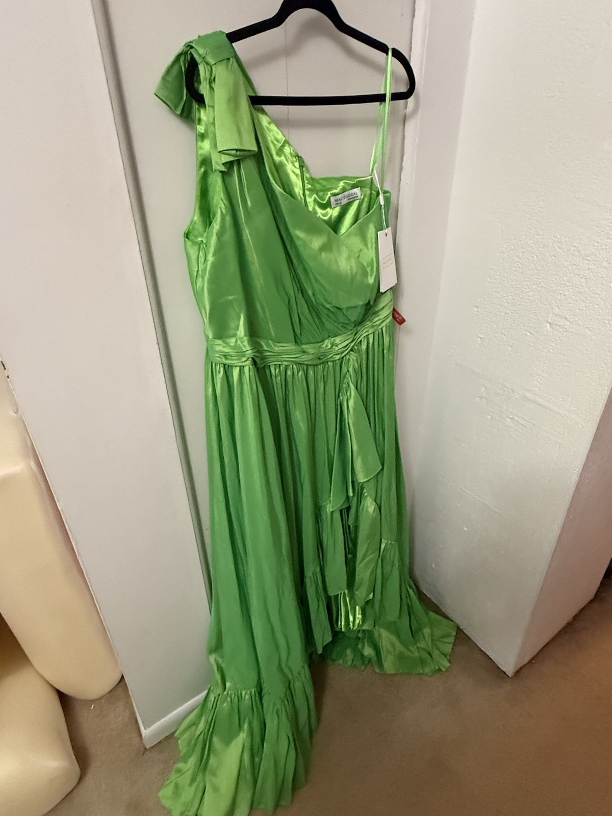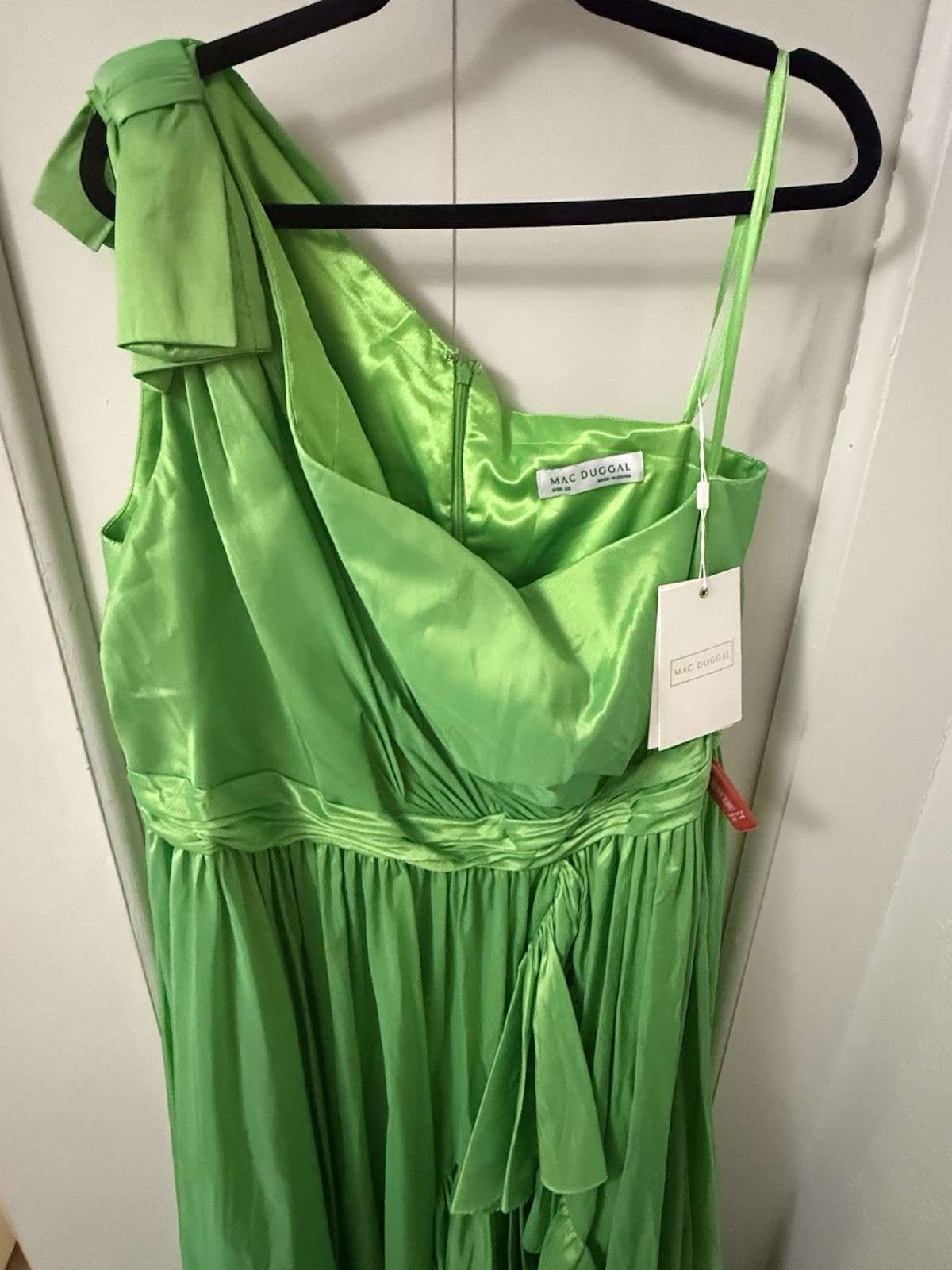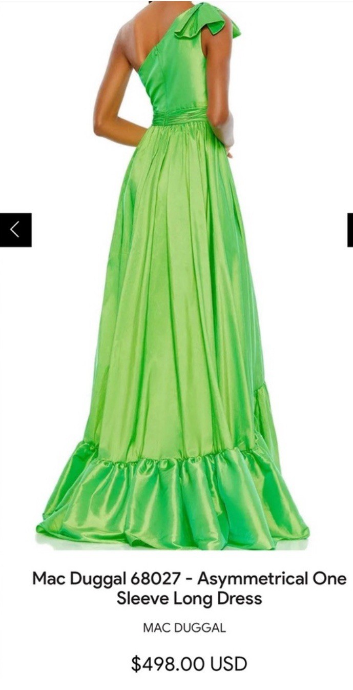The Mac Duggal NWT Green Bow One Shoulder Ruffle Asymmetrical Hem Gown Size 22 is a stunning formal gown perfect for weddings, parties, or cocktail events. Made from polyester taffeta, this gown features a sleeveless design with a one-shoulder neckline and a ruffled bow accent. The asymmetrical hem adds a touch of elegance, while the plus size fit ensures comfort and style. The long dress length and fit & flare silhouette add a touch of glamour to this beautiful gown in a captivating green color.