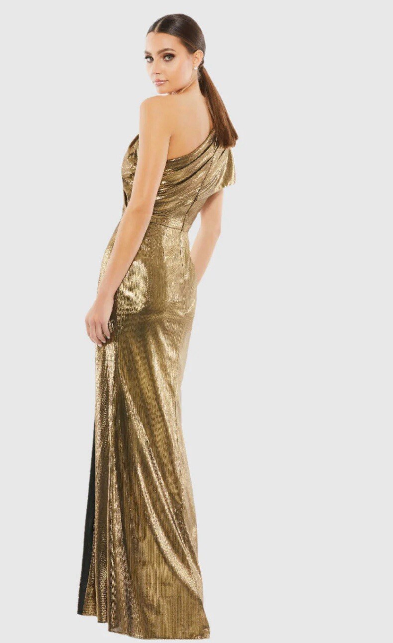 I purchased 2 dresses for my daughter’s wedding and decided to go with the other and missed the return window. -Mac Duggal Ruffled One-Shoulder Gown Size 12 - NWT -Metallic gown with asymmetrical one shoulder neckline and thigh high slit Ieena for Mac Duggal Metallic jersey fabric (100% polyester) -One shoulder neckline, Ruffled shoulder detail, Thigh-high slit -Concealed back zipper -Color - Bronze -Style #26600 -Runs slightly big - I am normally a 14 and size 12 in this brand fit me well.