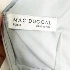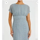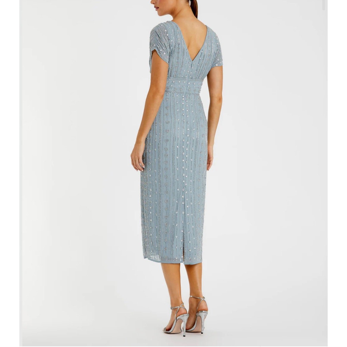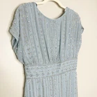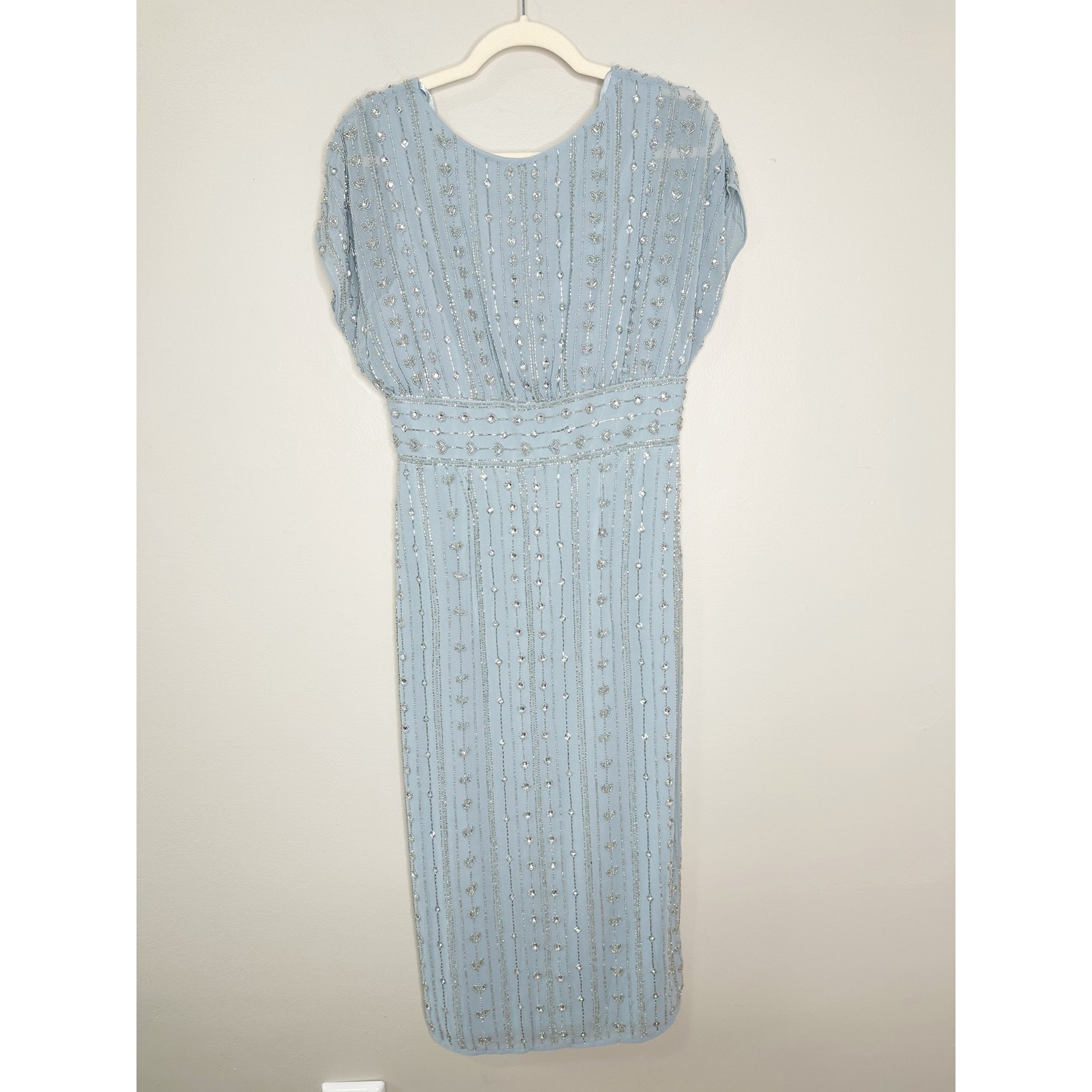 Mac Duggal 93649 Slate Blue Beaded Cap Sleeve Empire Waist Sheath Midi Dress 6 New with tags, a few beads are missing as shown in photos. Replacement beads are included. Size: 6 Hand-embellished poly georgette overlay; 100% polyester lining Fully lined through bodice and skirt; semi-sheer unlined sleeves Boat neckline with and empire waist Cap sleeves Allover vintage inspired beaded pattern composed of delicate beading and jewel encrusted embellishments Banded waist Concealed back zipper Approx. 48" from top of shoulder to bottom hem Available in Slate Blue (light blue) Style #93649 Turn heads at summer outdoor weddings and cocktail events in our Beaded Cap Sleeve Sheath Dress. With intricate embellishments, it exudes effortless elegance and seasonal charm. Tags: cocktail, formal, black tie. Mother of bride, mother of groom, gala, fundraiser, event wear, sparkle, glam, elegant, feminine