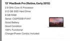 This MacBook Pro 13 Retina Early 2015 is a high-performance laptop that is perfect for a wide range of uses. With its powerful Intel Core i5 5th Gen. processor and 8GB of RAM, it is ideal for tasks like graphic design, gaming, and casual computing. The 13.3-inch widescreen display with a maximum resolution of 2560 x 1600 provides clear and vibrant visuals, while the integrated/on-board Intel Iris Graphics 6100 ensures smooth and efficient graphics performance. This laptop also features a 512GB SSD (Solid State Drive) for fast and reliable storage, as well as connectivity options like DisplayPort, HDMI, Mini DisplayPort, SD Card Slot, USB 3.0, USB 2.0, USB-C, and USB 3.1. It runs on macOS operating system and comes with built-in features like Bluetooth, Wi-Fi, built-in webcam, built-in speakers, multi-touch trackpad, backlit keyboard, force touch trackpad, and built-in microphone. This MacBook is missing two of the pads on the bottom of the unit as seen in the pictures. Also, the speakers work but rattle once in awhile. Other than that this unit is in excellent condition! Feel free to ask any questions!