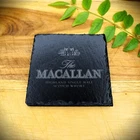 Macallan Slate Coaster – Handcrafted Elegance for Whisky Enthusiasts Elevate your whisky experience with our Macallan Slate Coaster , designed to reflect the sophistication and heritage of one of the world’s most iconic single malt Scotch whiskies. Each coaster is handcrafted from natural slate, offering a durable yet stylish foundation for your glass of choice. Premium Slate Material : Sourced from the finest natural slate, each coaster features a rugged, rustic texture with its unique surface patterns. Slight variations in texture give each piece its own character. Laser-Engraved Design : The intricate Macallan logo and whisky-inspired motifs are precision laser-engraved, creating a striking contrast between the dark slate and the elegant design. The engraving is long-lasting and resistant to wear. Perfect for Whisky Lovers : Ideal for Macallan aficionados, this coaster not only protects your surfaces from condensation but also adds a touch of class to your home bar, office, or tasting room. Dimensions : Measuring 4 inches in diameter with a thickness of 0.25 inches, this coaster fits all standard whisky glasses while being compact enough for easy storage. Handcrafted in the USA , each coaster undergoes a careful quality inspection to ensure it meets our high standards. Whether for yourself or as a gift for the whisky lover in your life, our Macallan Slate Coaster combines functionality with timeless elegance. Specifications: Made-to-order, premium quality Slate coaster. Material: Natural slate Dimensions: Round Coaster: Approximately 4 inches in diameter Square Coaster: Approximately 4 inches x 4 inches Thickness: 0.25 inches Color: Natural slate gray with white engraving Category: Design: Macallan Protective finish: Yes Order will be processed within 24 hours and shipped out ASAP. Coasters are Designed and Engraved in the USA