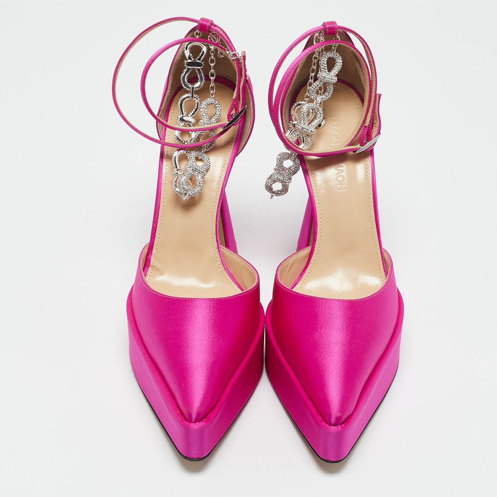 These Mach and Mach pumps combine timeless elegance with contemporary style. The soft pink satin is adorned with a crystal embellished bow and chain detail at the ankle strap, creating a glamorous and luxe aesthetic. The perfect choice for evening occasions, these pumps add a touch of sparkle and sophistication to any outfit.Certified by The Luxury Closet - This item has gone through a detailed authentication process overseen by our experts. We offer a lifetime guarantee of authenticity on all our items. Import duties, taxes and charges are not included in the item price. These charges are the buyers responsibility. Please check with your country’s customs office to determine what these additional cost will be prior to buying. Our eBay Store About Us Contact Us Add to Favorite Sellers Mach & Mach Pink Satin Crystals Bow Chain Pumps Size 37.5 $266.2 These Mach and Mach pumps combine timeless elegance with contemporary style. The soft pink satin is adorned with a crystal embellished bow and chain detail at the ankle strap, creating a glamorous and luxe aesthetic. The perfect choice for evening occasions, these pumps add a touch of sparkle and sophistication to any outfit. Product Details Brand Color Pink Dimensions Material Satin Size 37.5 Outsole Width 9 cm Outsole Length 26 cm Heel Height 13 cm Includes The Luxury Closet Packaging Certified by The Luxury Closet This item has gone through a detailed authentication process overseen by our experts. We offer a lifetime guarantee of authenticity on all our items. How We Check The in-house team of experts at The Luxury Closet is highly trained to verify the authenticity and the condition of the luxury products. They ensure that only 100% authentic items are put on sale.The evaluation process is unique with its own mix of assessment criteria and differs according to the category. Each item is evaluated based on the following combination of hallmarks, hardware, stitching, symmetry, material, craftsmanship, stamping, codes, hologram stickers, and packaging. Our authenticators also check if the items have been modified or amended (e.g., aftermarket diamonds, replaced batteries, repaired bags, etc.) International Buyers Import duties, taxes and charges are not included in the item price. These charges are the buyers responsibility. Please check with your country’s customs office to determine what these additional cost will be prior to buying.