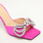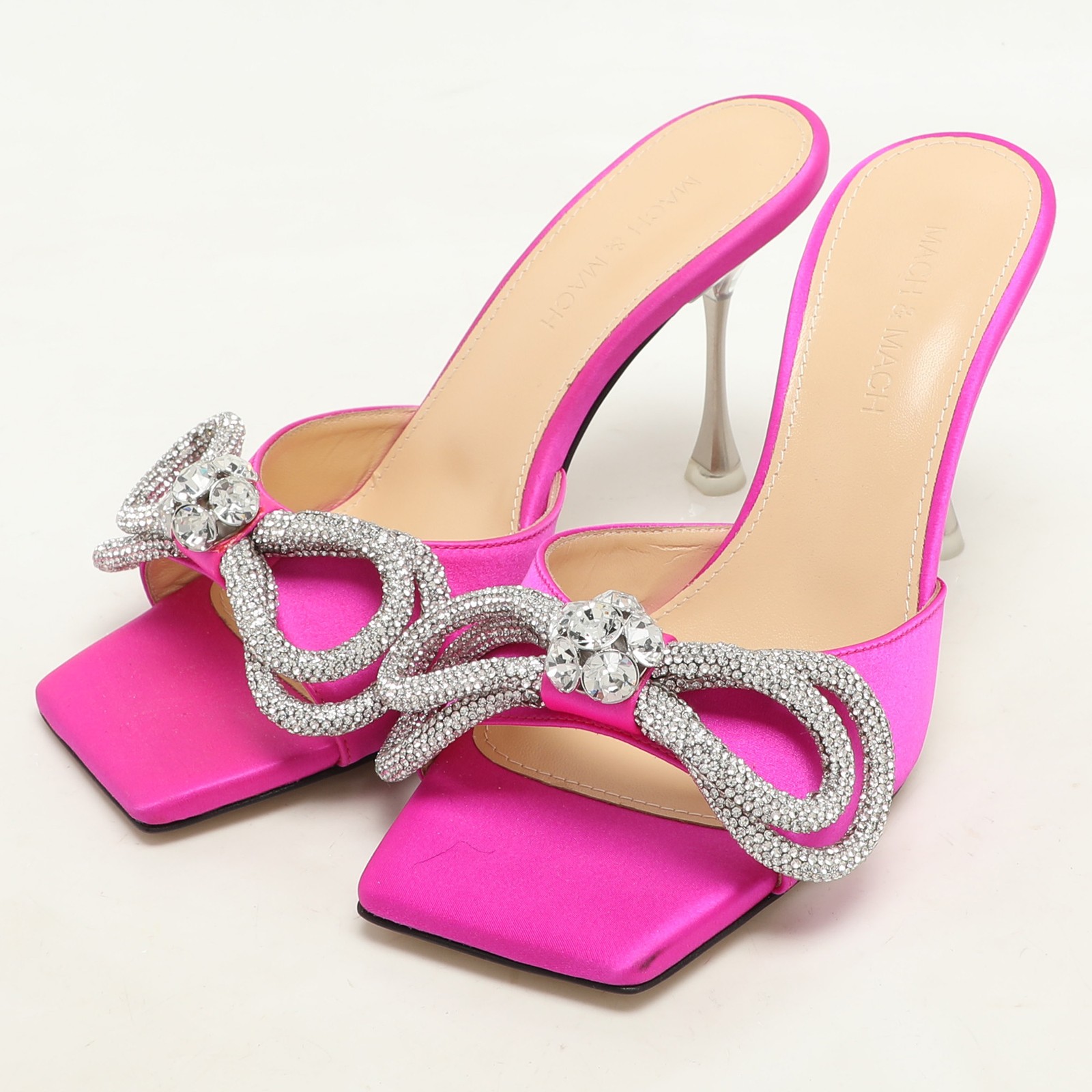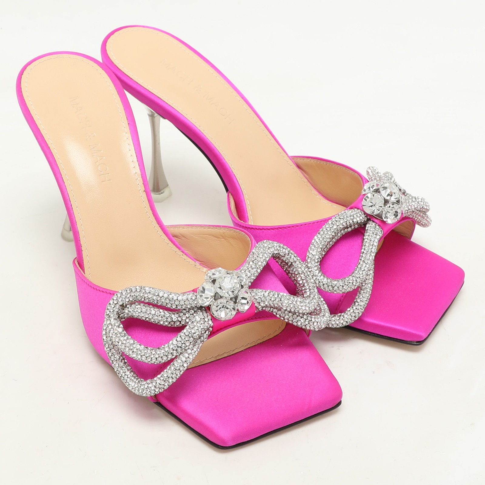 Crafted from luxurious satin, these enchanting pink slides by Mach and Mach epitomize elegance. Adorned with sparkling crystal embellishments, the double bow design adds a playful yet sophisticated touch. The leather lining and insole deliver unmatched comfort for every step, while the sleek leather sole ensures durability.Certified by The Luxury Closet - This item has gone through a detailed authentication process overseen by our experts. We offer a lifetime guarantee of authenticity on all our items. Import duties, taxes and charges are not included in the item price. These charges are the buyers responsibility. Please check with your country’s customs office to determine what these additional cost will be prior to buying. Our eBay Store About Us Contact Us Add to Favorite Sellers Mach & Mach Pink Satin Crystal Embellished Double Bow Slide Sandals Size 37 $541.2 Crafted from luxurious satin, these enchanting pink slides by Mach and Mach epitomize elegance. Adorned with sparkling crystal embellishments, the double bow design adds a playful yet sophisticated touch. The leather lining and insole deliver unmatched comfort for every step, while the sleek leather sole ensures durability. Product Details Brand Color Pink Dimensions Material Satin Size 37 Outsole Width Outsole Length Heel Height Includes Certified by The Luxury Closet This item has gone through a detailed authentication process overseen by our experts. We offer a lifetime guarantee of authenticity on all our items. How We Check The in-house team of experts at The Luxury Closet is highly trained to verify the authenticity and the condition of the luxury products. They ensure that only 100% authentic items are put on sale.The evaluation process is unique with its own mix of assessment criteria and differs according to the category. Each item is evaluated based on the following combination of hallmarks, hardware, stitching, symmetry, material, craftsmanship, stamping, codes, hologram stickers, and packaging. Our authenticators also check if the items have been modified or amended (e.g., aftermarket diamonds, replaced batteries, repaired bags, etc.) International Buyers Import duties, taxes and charges are not included in the item price. These charges are the buyers responsibility. Please check with your country’s customs office to determine what these additional cost will be prior to buying.