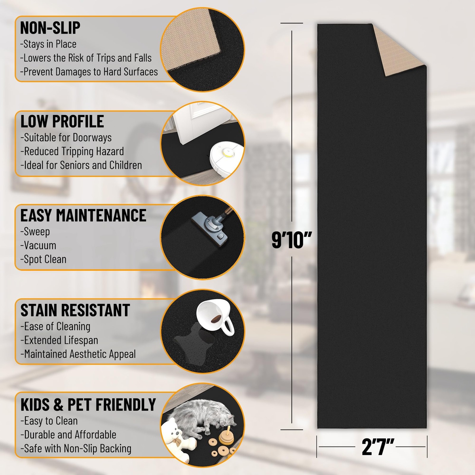 [Non-Slip Backing for Hard Floors]: Rubber backing helps keep the rug in place on tile, hardwood, or laminate—ideal for homes with kids, pets, or busy foot traffic. [Slim 0.2-Inch Profile Clears Doors]: Low-pile construction allows for smooth door clearance and easy furniture placement—perfect for hallways, kitchens, and transitional spaces. [Durable Nylon Built for Daily Traffic]: Tightly woven nylon fibers hold their shape and color over time—stands up to everyday wear in active households. [Stain-Resistant and Easy to Maintain]: Designed to handle life’s messes—vacuum regularly or spot clean for a rug that stays looking fresh. [Simple Solid Colors That Blend In]: Available in versatile neutrals and bold tones like black, red, beige, and navy—easy to match with any room décor or flooring.