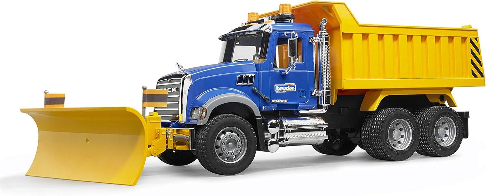 Store New Arrivals Add to Favorite View Feedback Contact Mack Granite Dump Truck with Snow Plow & Light/Sound | Realistic 21" Construction Toy for Indoor & Outdoor Pretend Play Description Item model number 2825 Style 02825 MACK Granite Dump Truck with Snow Plow Blade for Construction and Farm Pretend Play with Light & Sound Module Product Dimensions 25.75 x 7.5 x 10 inches Item Weight 0.882 ounces Batteries 2 AAA batteries required. Manufacturer recommended age 36 months - 15 years Department womens Is Discontinued By Manufacturer No Release date January 1, 2014 The Mack Granite Dump Truck features a lifelike design with a driver's cabin that opens, tilting engine bonnet, and foldable rear-view mirrors, measuring about 21" x 7.4" x 8". Offering interactive play, the truck's tipping bed allows for realistic loading and unloading, complemented by a functional tailgate that opens like an actual truck. For winter-themed play, an attachable snow plow blade transforms the truck into a snowplow, featuring an adjustable angle and a lever for lifting in or out. Elevating the play experience, the truck includes a light and sound module, simulating engine noises, flashing lights, and sirens, with an auto switch-off function after about 18 seconds. Designed for children aged 4 and above, this toy ensures both indoor and outdoor enjoyment, accompanied by a safety warning about small parts. The "incredibly" realistic driver's cabin with its doors that can be opened, the tilting engine bonnet, providing a view of the engine block, the foldable rear-view mirrors, and the many add-on accessories, which give the its chrome look, make this truck a true feast for the eyes of every truck fan. To expand the play options, you can attach a rake blade (Item No. 02573), a sweeping machine (Item No. 02577) or a cable winch (assortment Item No. 02008) (not included) to the receiver on the MACK Granite's fender. And on winter days with thick snowfall powerful helpers are required to assist road traffic. The plough blade makes snow-covered landscapes even more fun for children. The flags that can be attached to the left and right of the plough blade make it look even more realistic. ABOUT US We offer the best prices around on high quality products. Our E-store includes media such as books, movies, music and games while offering electronics, toys, sporting apparel, clothing, tools, general home, garden items and more. SHIPPING We are always working hard to ensure your package arrives as soon as possible. Please understand that some factors like weather, high postal traffic, and the performance of shipping companies are outside of our control. We offer free shipping to the lower 48 states and ship within 2 business days of payment, usually sooner. We do not accept P.O. Boxes. Please provide a physical address. RETURNS We offer a 30-Day Return Policy on items which you are not completely satisfied with. You have the option for a full-refund or an exchange of the item. No returns are available on items shipped outside of the USA. PAYMENT We accept PayPal. CONTACT US This page content is yet to come Please ad us to your favorite seller and visit again later Thank You CUSTOMER SATISFACTION We try our very best to make sure every customer is completely satisfied. If there's a problem, message us! We're happy to help.