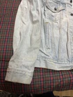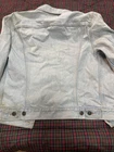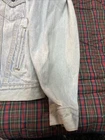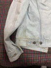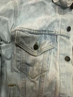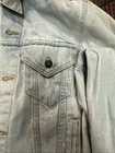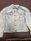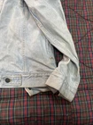 This Levi's Trucker jacket is a classic Type 3 denim jacket in a light blue color with a heavy fade, made in the USA. It features a regular fit, size M, and is crafted from cotton denim fabric. The style is iconic of Levi's, embodying a USA theme with its quality construction and design.