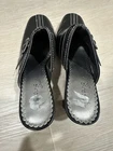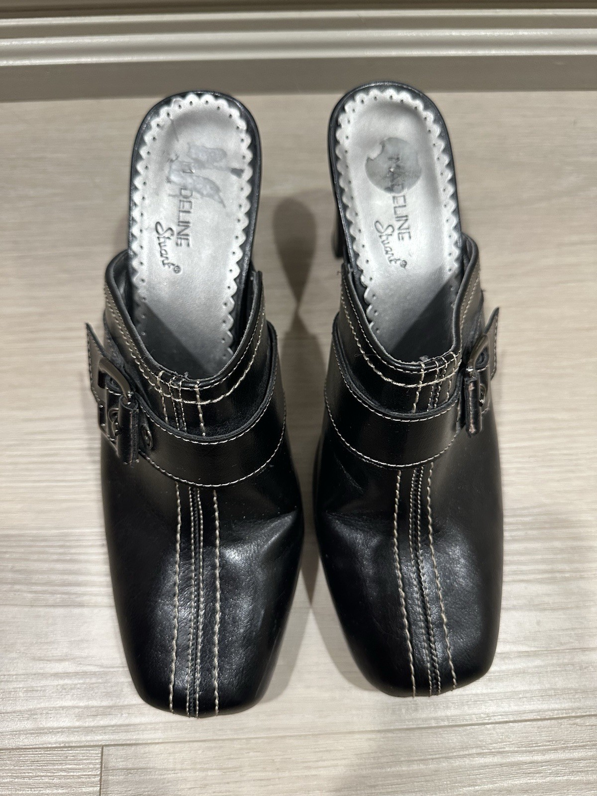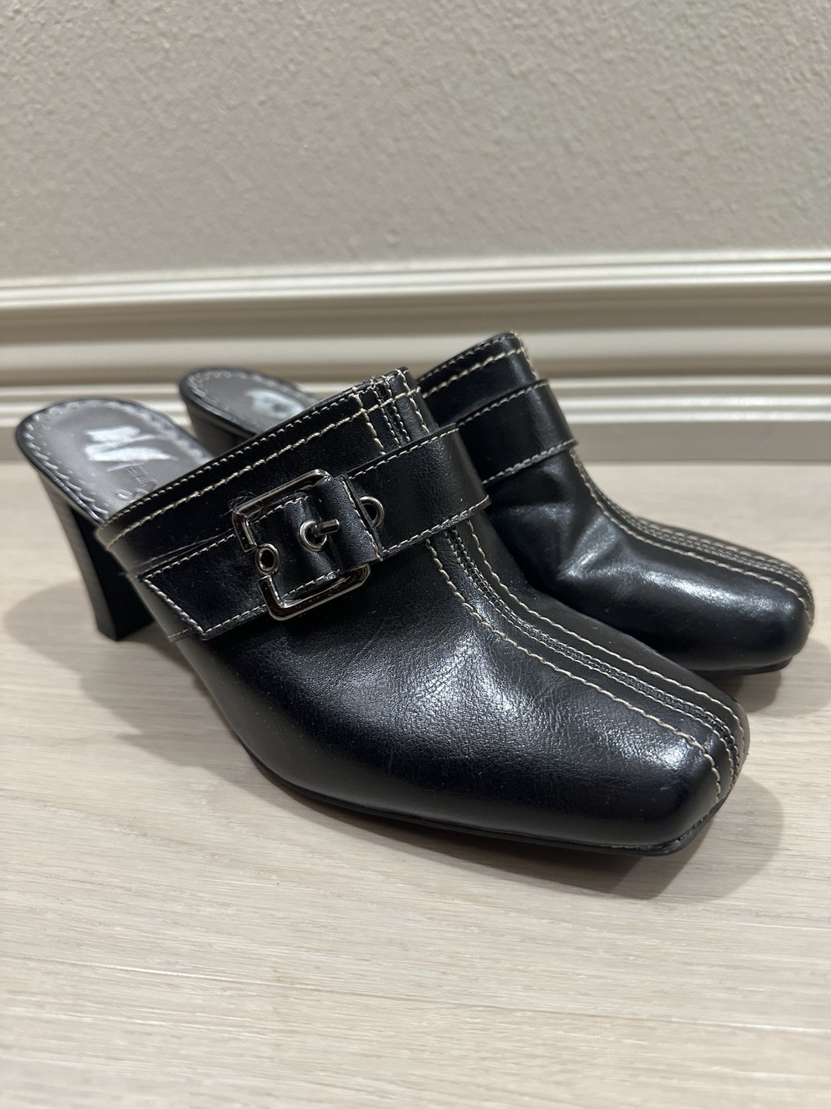 Condition: Pre-owned. Good condition. Light surface wear and minor scuffs consistent with normal use. Heel tips show light wear. Footbeds show cosmetic wear. See photos. Details: • Brand: Madeline Stuart • Women’s size 8.5 M • Black leather upper • Slip-on mule style • Square toe • Buckle strap detail • Block heel • Contrast stitching • Synthetic sole Measurements: • Size: Women’s 8.5 Medium • Heel height: approx. 2.5” (estimate based on photos) Notes: Classic early-2000s inspired mule heels with a structured square toe. Easy slip-on style suitable for office, casual, or dress wear. Keywords: Madeline Stuart heels, black leather mules, square toe heels, buckle mule shoes, womens block heel mules, slip on heels, Y2K heels, office shoes women
