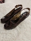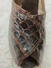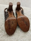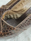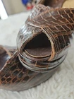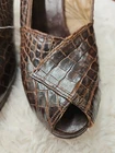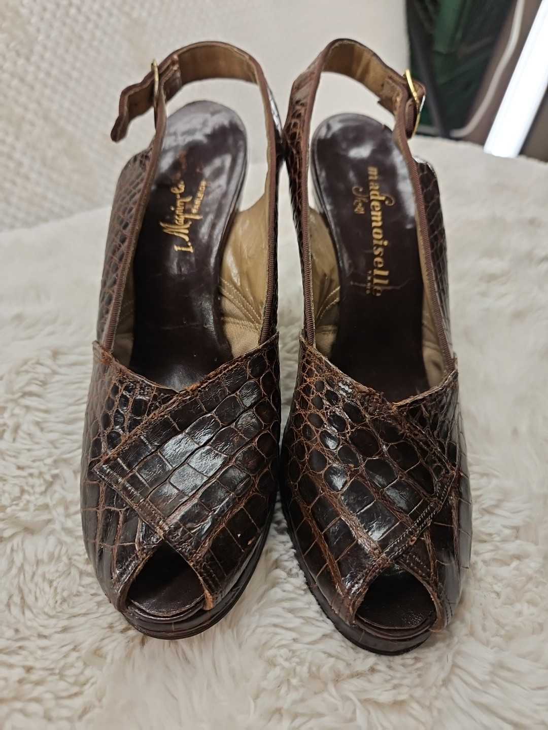 These stunning Mademoiselle pumps are the perfect addition to any fashion-savvy woman's shoe collection. With a sleek brown alligator leather upper material and an eye-catching animal print pattern, these heels are sure to turn heads at any occasion. The open-toe design and adjustable slingback strap with buckle closure provide a comfortable and secure fit, while the ultra-high block heel adds a touch of sophistication and elegance. These vintage pumps are perfect for travel, weddings, parties, or even casual and formal occasions. The leather insole and outsole ensure durability and long-lasting wear, while the fabric lining material provides a comfortable fit. These size 8 aaaa pumps are a must-have for any fashion-forward woman looking to make a statement with their footwear. These are very narrow fitting shoes...They are vintage shoes, but are in remarkable shape....B1090