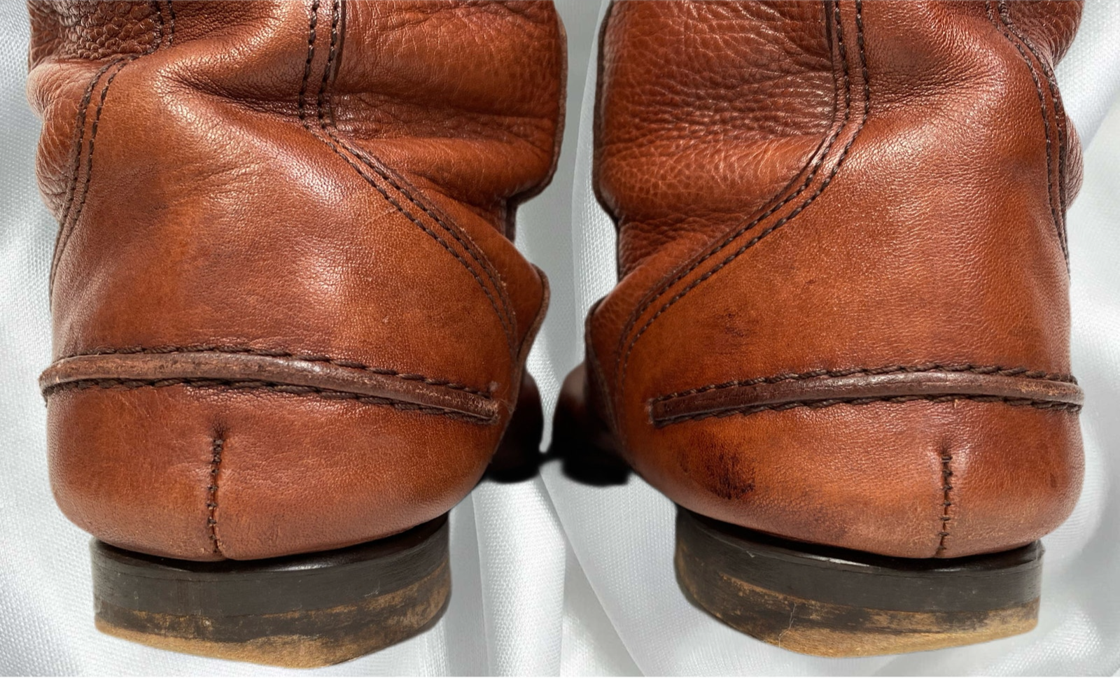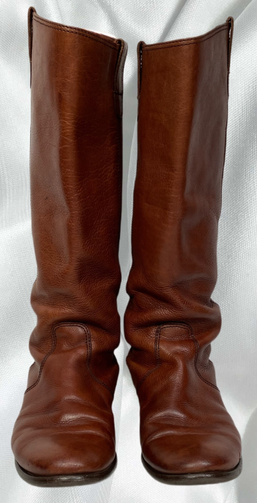 Madewell 1937 leather riding boots. These boots are well broken in. Leather upper, leather lined. 3/4” heel has some wear as shown on photos. 15” shaft. Unknown size, sole measures 10” from heel to toe. Estimate size 7/7.5. 0718WW