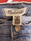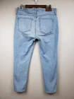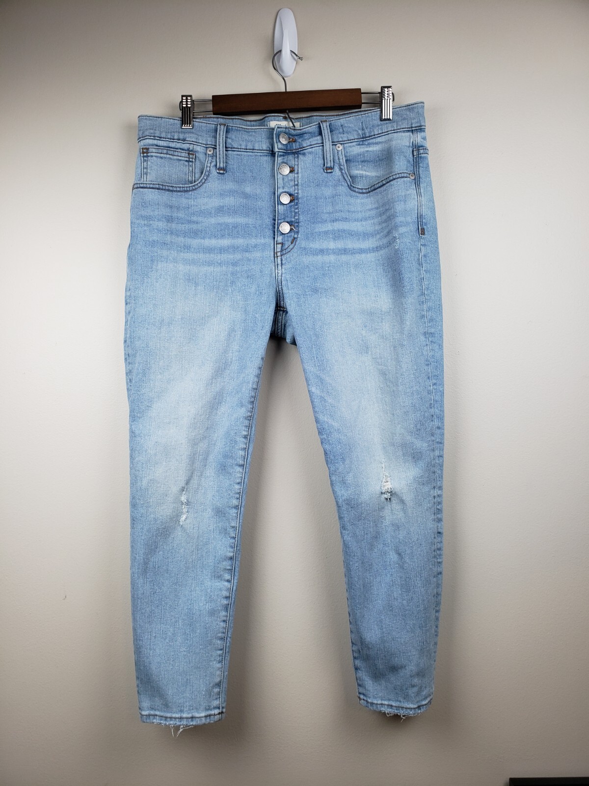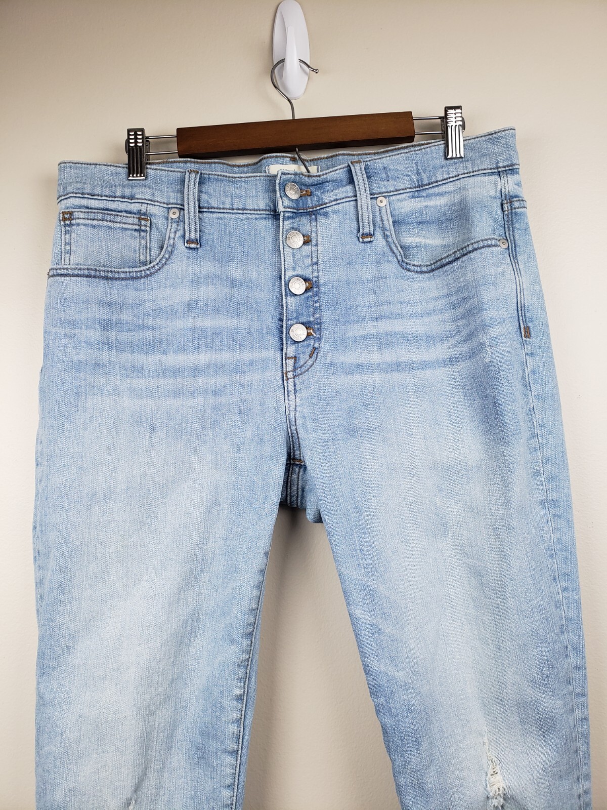 Madewell 9" High Rise Skinny Jeans Women's 32 Blue Stretch Denim Distressed Light. Regular wear including a small mark on back of thigh and near button (pictured) overall good pre-owned condition. Measurements shown in photo.