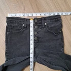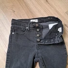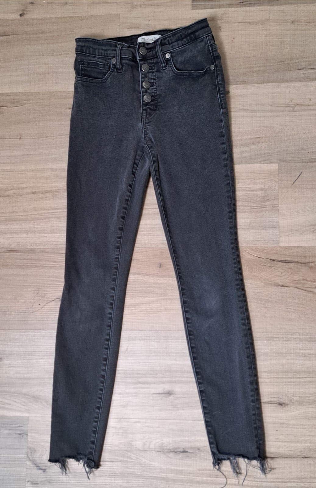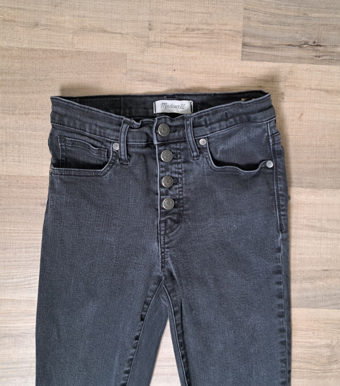 Used in great condition. Please see pictures for details and measurements laying flat. Elevate your denim game with these Madewell Women's Black Button Fly Skinny Jeans. Featuring a solid pattern, 5-pocket design, and a button closure with a logo accent, these jeans are perfect for any hipster, festival, rock, bohemian, 90s, gothic, or preppy themed outfit. The dark wash denim fabric is made of a blend of polyester, cotton, and elastane, making them comfortable, stretchy, and easy to care for with machine washable properties. The slim fit and hi-rise waist with a 8.5 inch rise and 27 inch inseam are perfect for any occasion. These jeans are a must-have for any wardrobe and can be worn throughout the year in any season.