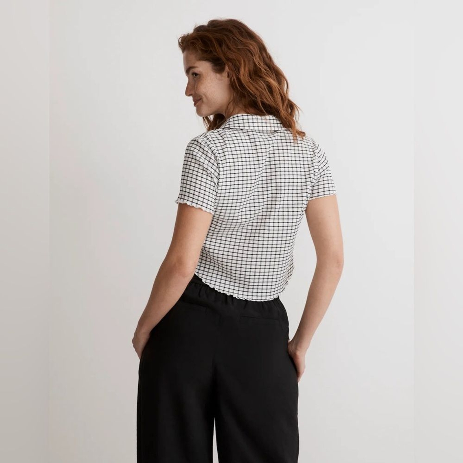 Coming in a textural windowpane-patterned fabric, this cropped tee has an open polo collar and low-key ruffled hem. Cute detail alert: we love the little square buttons. Regular fit. Crop length: designed to hit low on the ribcage and show a hint of skin. Body length from high point of shoulder: 19 1/4" (based on size M). Polyester/elastane. Machine wash. Imported. Item NL361 Fits true to size