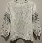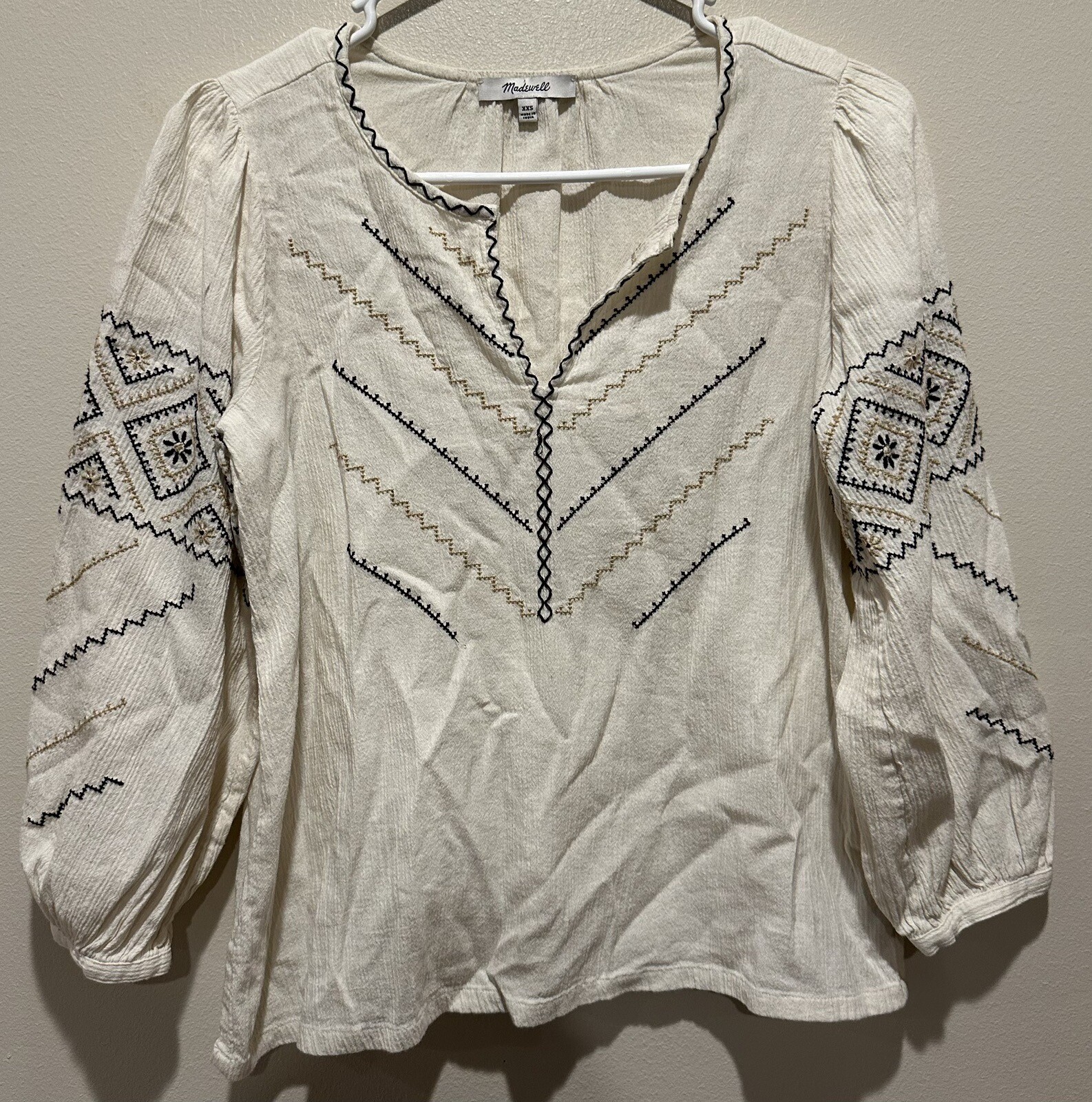 Elevate your wardrobe with this stunning Madewell embroidered peasant top in size XXS.Made of airy crinkled cotton, this peasant-y top has a notched neck, bracelet-length puff sleeves and intricate embroidery. The kind of folk-y style your aunt might've worn in the '70s. - Regular fit. - Body length from high point of shoulder: 23 3/4". - Cotton. - Machine wash. - Import. No rips holes or stains! Pre-Owned!