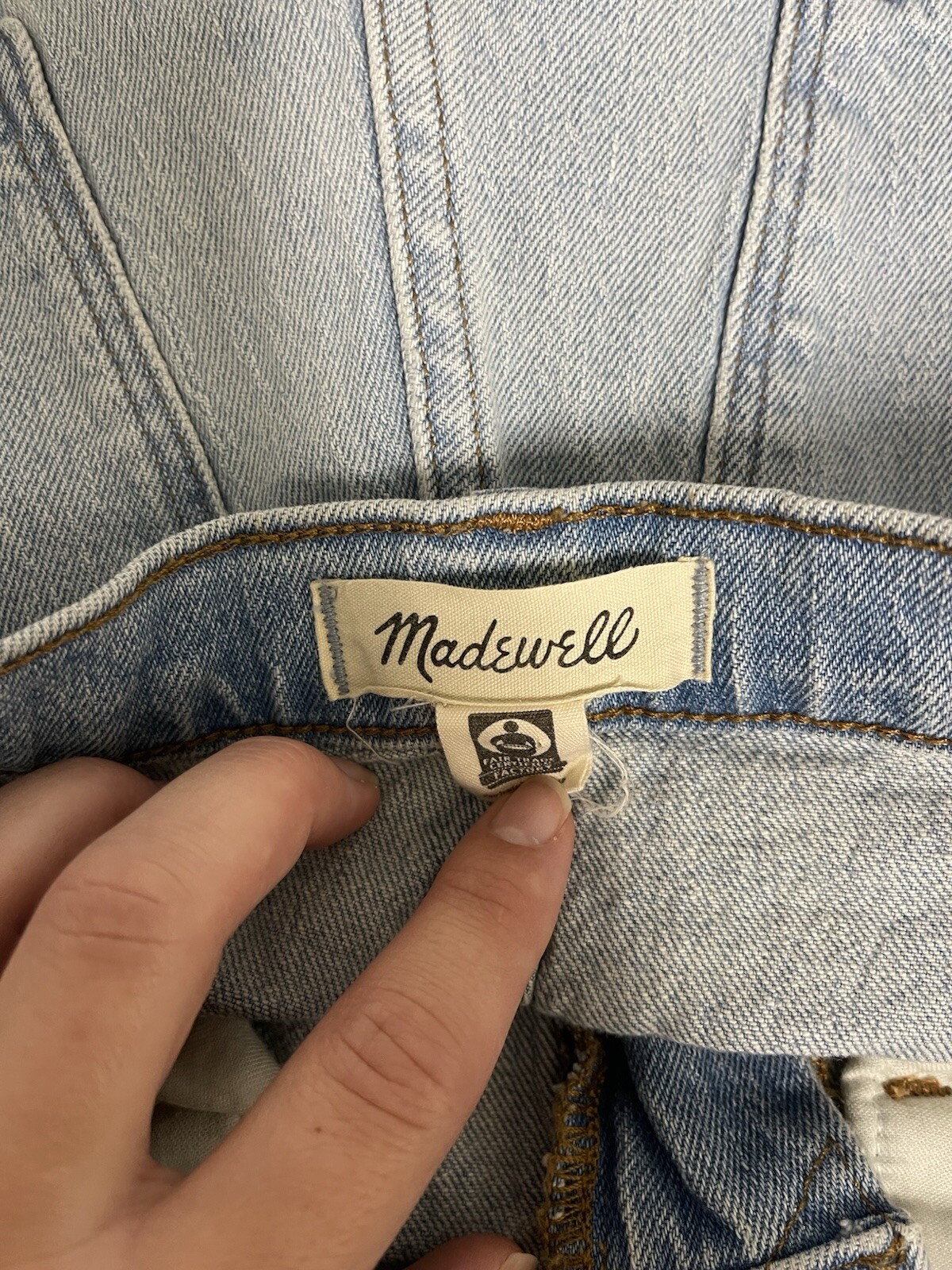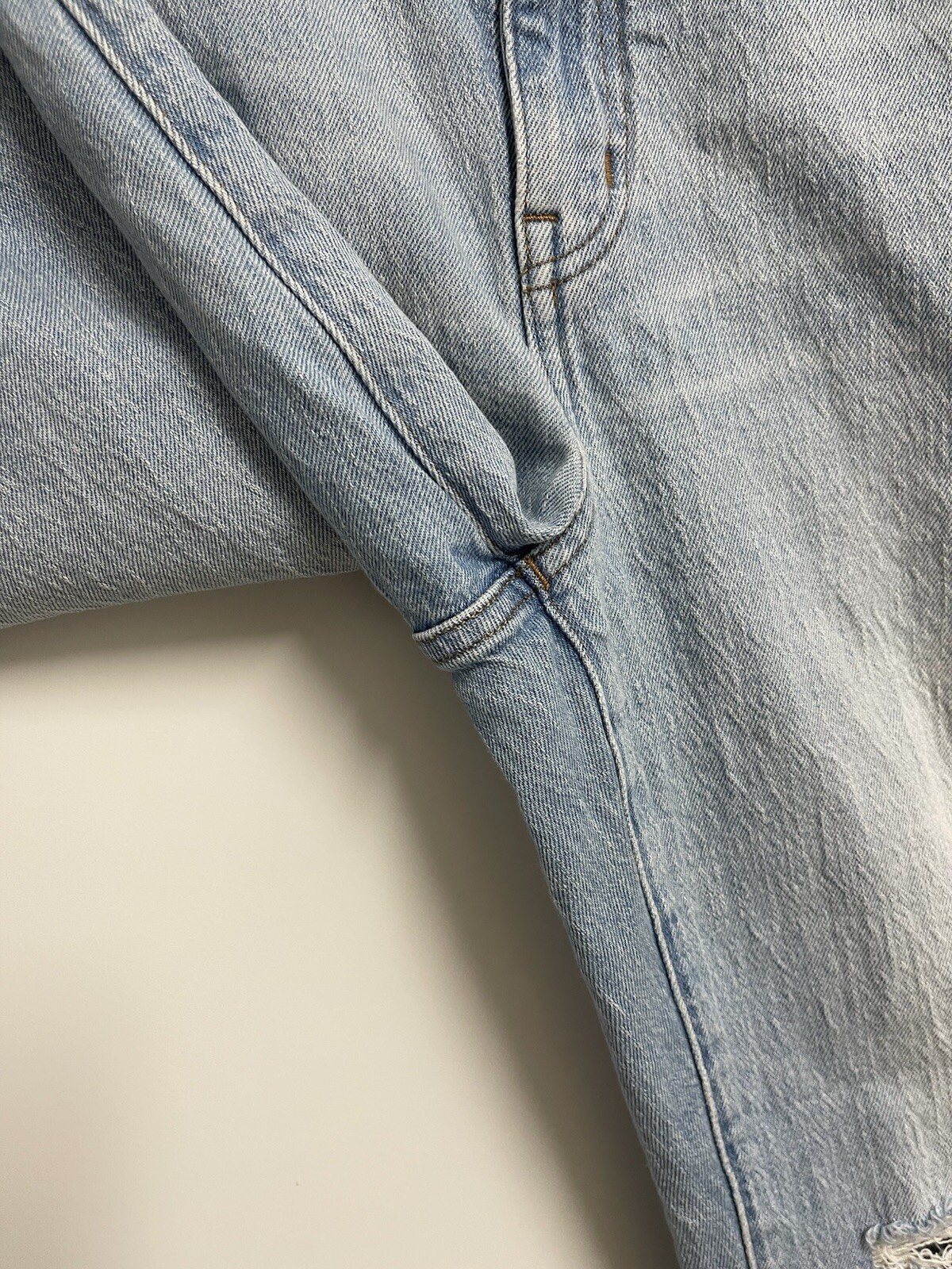 size: 26 color: light wash denim material: cotton and elastane high rise fit slight distressing at the knee slim fit cropped length estimated measurements 15 in waist 10.5 in rise 25 in inseam