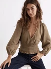 Sweet and smocked in Madewell’s supersoft Lightspun double-layered cotton gauze, this cropped faux-wrap top is fitted through the waist. Cute bubble sleeves and a ruffled hem make it a romantic dream. -Regular fit. - Body length from high point of shoulder: 20 1/2". - Cotton. - Do Well: Madewell partnered with the Better Cotton Initiative to improve cotton farming globally. No rips holes or stains! Excellent condition!