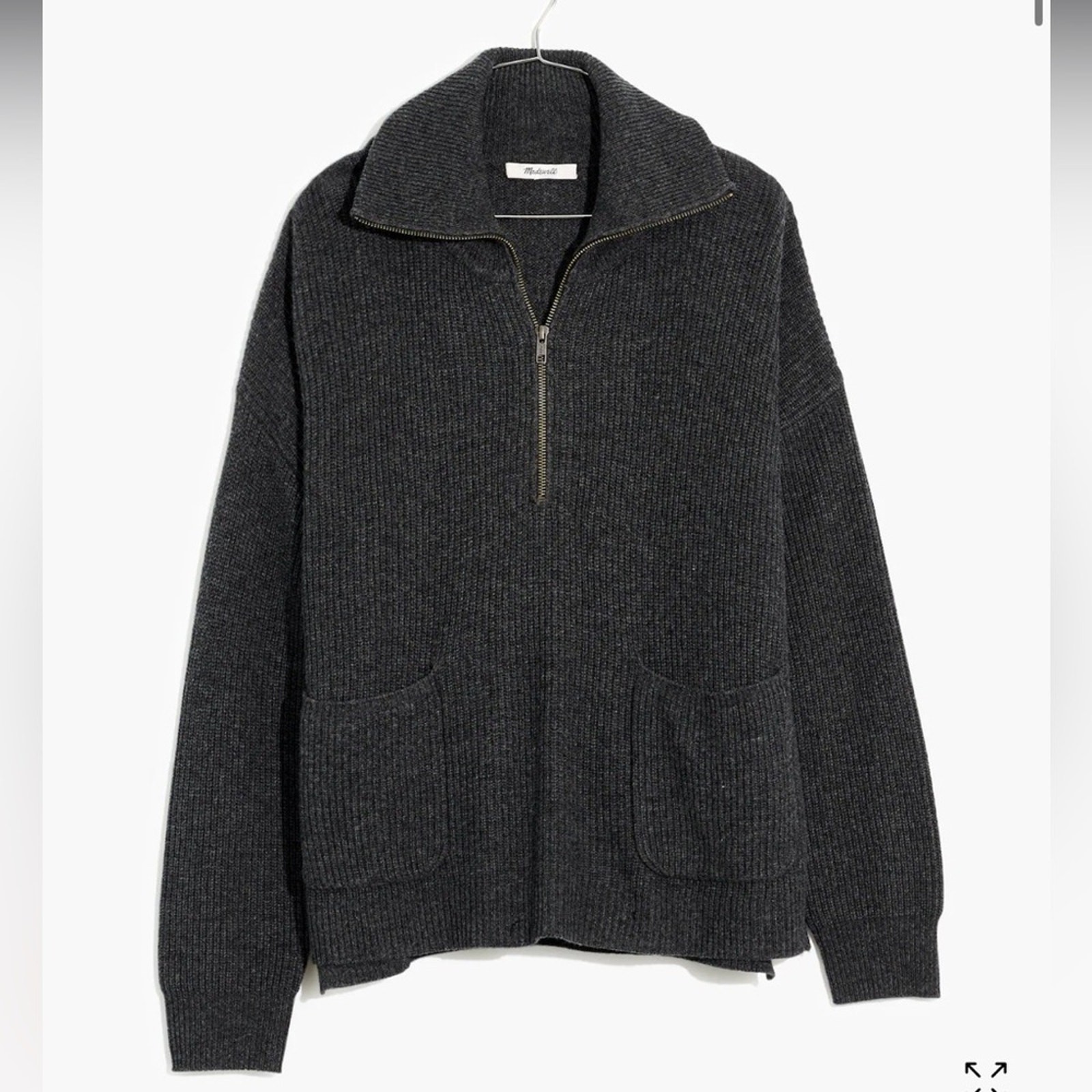 With a foldover half-zip collar and patch pockets, this ribbed... sweater is a switch-up from your regular rotation of casual crewnecks. • Boxy fit. • Body length from high point of shoulder: 23 3/4" (based on size M). • Wool/polyamide. • Do Well: This style is made of wool from certified farms who take a progressive approach to managing their land and caring for their sheep. • Machine wash. • Import. • File under: Madewell sweaters for women. • Item NB393
