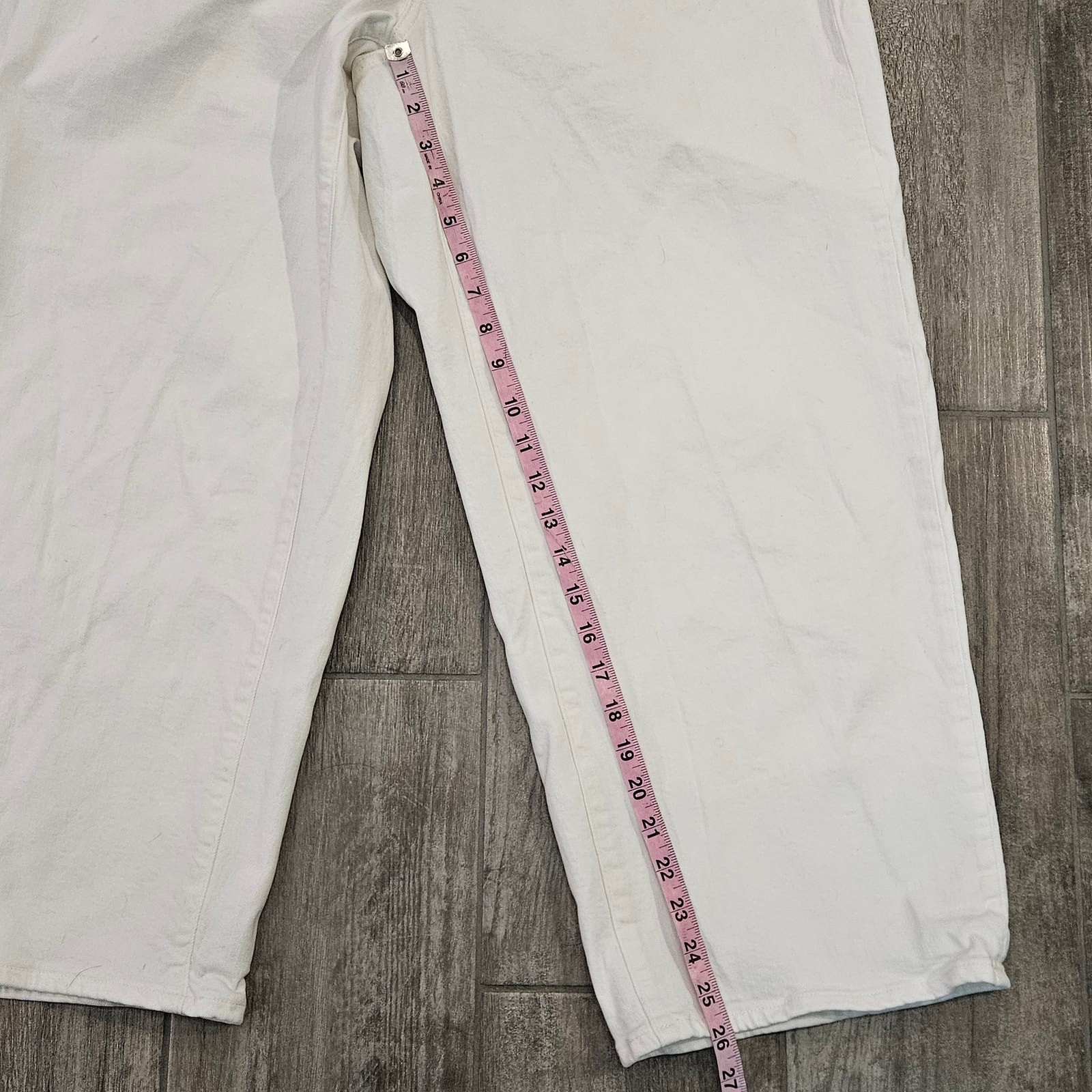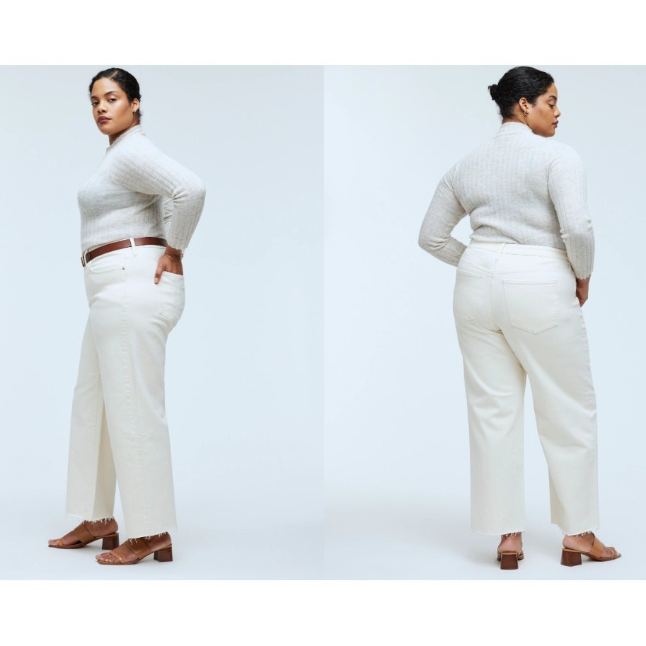 Madewell Perfect Vintage Wide-Leg Crop Jeans 16W Ecru Raw Hem High Waist Wide Leg Description: These Madewell “Perfect Vintage” jeans are wide-leg cropped in an ecru wash with raw hems for a cool, relaxed silhouette. High-rise waist with “Magic Pockets™” in front—designed to flatter and hold you in. Fabric is premium Cone® denim (98% cotton / 2% elastane) giving structure with a touch of stretch for comfort from day one. Size 16W. Inseam approx 26½″. Good pre-owned condition. There are a couple very tiny spots that might wash out; I have not tried. No rips or major wear; raw hems are intact. Keywords: Vintage Inspired, Raw Hem, Wide Leg, Crop Jeans, High Rise, Plus Size Fashion, Ecru, Minimalist, Neutral, Sustainable Denim, Casual Chic, Street Style, Retro, Clean Lines, Relaxed Fit