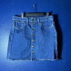 This Madewell Women's Annetta Wash Button Front Stretch Denim Straight Mini Skirt in size 32 features a solid blue color with button closure. The skirt is made of a cotton and elastane blend, providing stretch for a comfortable fit. With a mid-rise and mini length, this skirt is suitable for casual or travel occasions and can be machine washed. The denim fabric type and button accents add a stylish touch to this versatile skirt, perfect for all seasons. Approximate Measurements Length:18" Armpit: 17" Great conditions from a smoke free home. MC-138