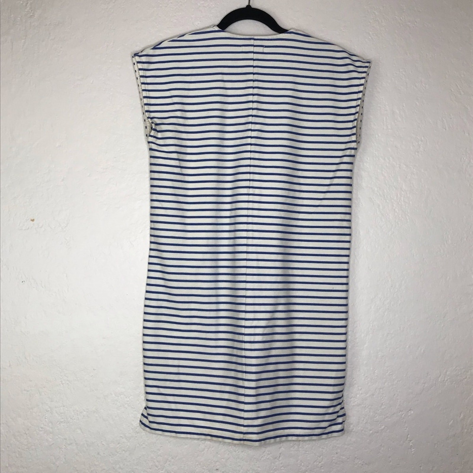 Madewell Women's Blue Striped Vacances V-Neck Cap Sleeve T-Shirt Dress Striped print V-neck Cap sleeves Textural knit Side vents Great as a casual summer dress or beach coverup Size: Small Color: White and Blue Measurements: Approximate - Flat Pit to Pit 19", Length 32-33" Preowned used condition Puppy friendly store