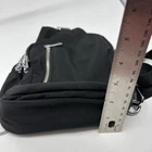 The Madison West sling backpack is designed for everyday convenience. Its compact size and adjustable strap make it easy to carry essentials. • Zipper closures for secure storage • Adjustable shoulder strap for comfort • Lined interior with additional pocket • Compact size for daily use No visible condition flaws. Measurements: Length = 11 inches, Width = 8 inches, Depth = 3 inches.