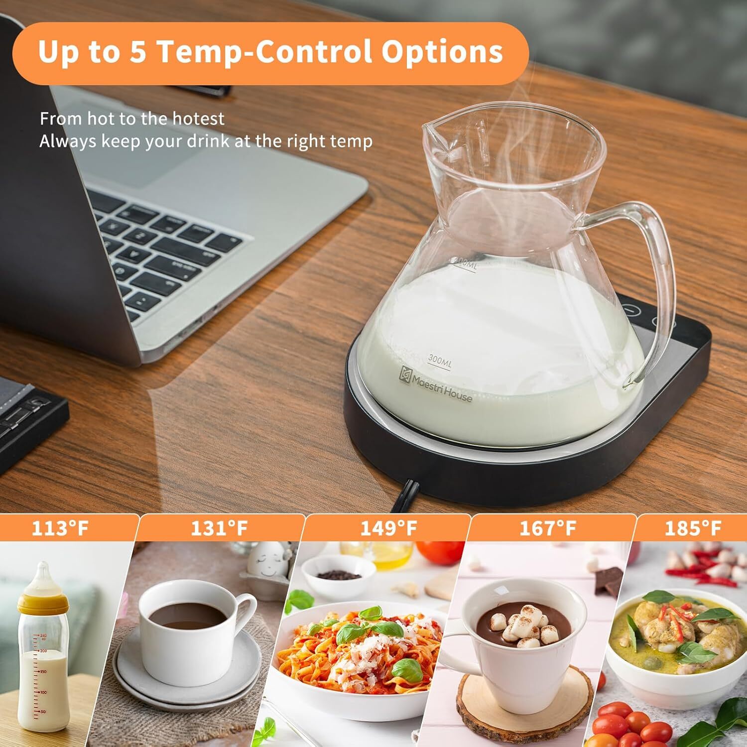 Customizable Temperature Control: Enjoy your favorite beverages at the perfect temperature with our Coffee Warmer featuring multiple temperature settings. Easily switch between temperatures ranging from 104℉ to 185℉ to find your ideal heat level according to 4 different modes. Discover the ideal temperature tailored specifically for different materials. 6-Level Timing & Auto Shutdown: Our coffee cup warmer comes with a convenient 6-level timer function, allowing you to set it for any duration between 2 to 12 hours. By default, it has an automatic shutdown time of 8 hours. You can easily adjust the timer according to your preferences, ensuring the perfect warmth for your coffee. It will automatically turn off when the set time is reached, eliminating any concerns about forgetting to close it. Intelligent Temperature Control: This coffee cup warmer maintains a consistent and precise temperature, preserving the flavor and aroma of your favorite coffee for a delightful experience with every sip. Versatile Compatibility: Our coffee mug warmer is designed to work seamlessly with a wide range of cups, including flat cups and mini coffee pots. Whether you have a glass, ceramic, metal, or other material cup, our beverage warmer is perfect for heating tea, coffee, and even flameless scented candles, providing versatile functionality. Compact Design & Practical Gift Option: With its sleek and compact design, coffee mug warmer seamlessly blends into any environment, adding a touch of elegance to your coffee-drinking experience. Perfect as a gift for coffee lovers, the coffee cup warmer combines functionality and style, making it an ideal choice for home or office use. Product Description Custom Warmth, Anytime, Anywhere 2-12 Hours Keep Warming Precise 5 Tem Control Options Designed for Multiple Usages Your Cups, Our Heat: Universal Warmer Elevated Warmth: Innovative Heat Board How to Use