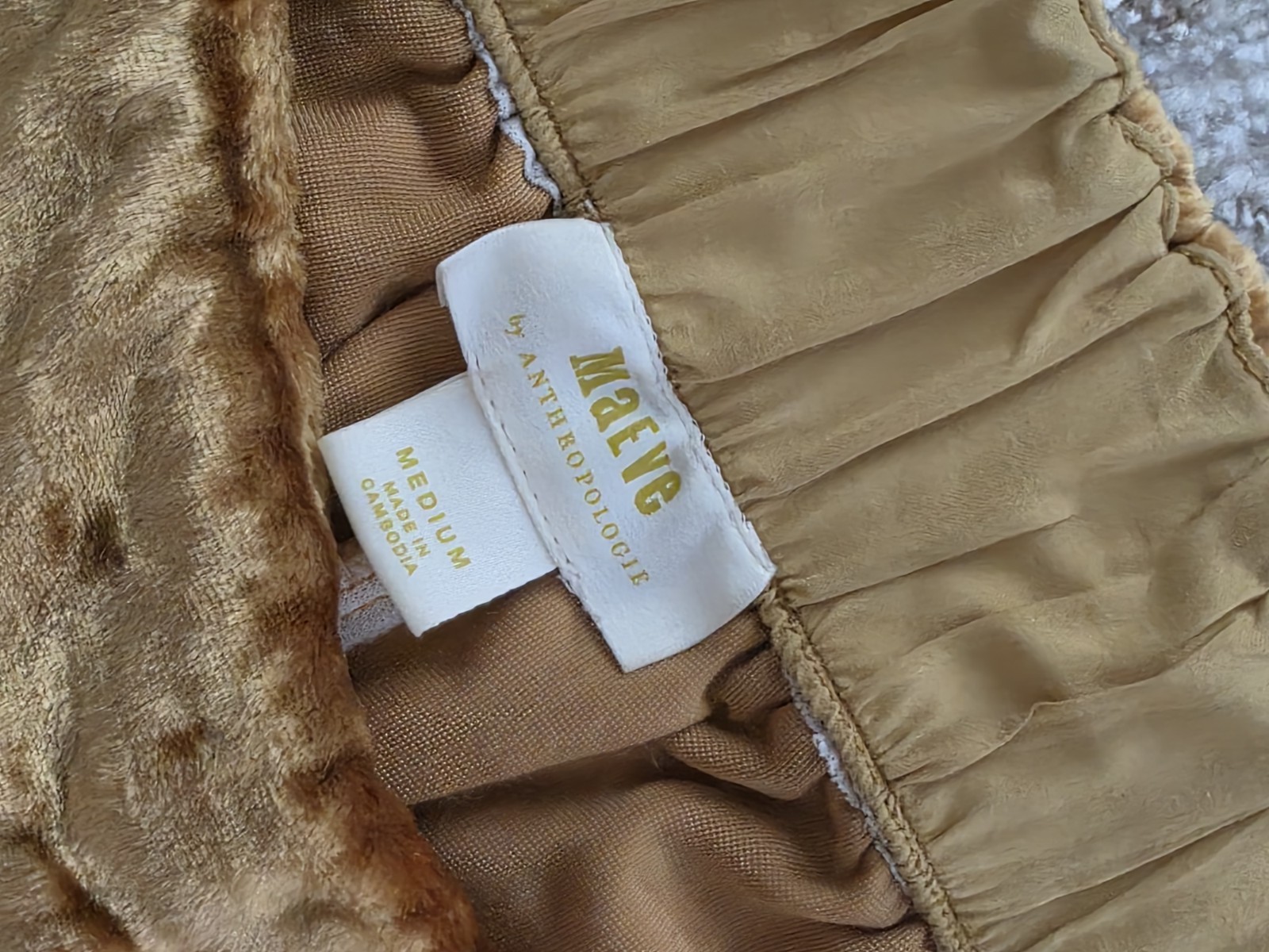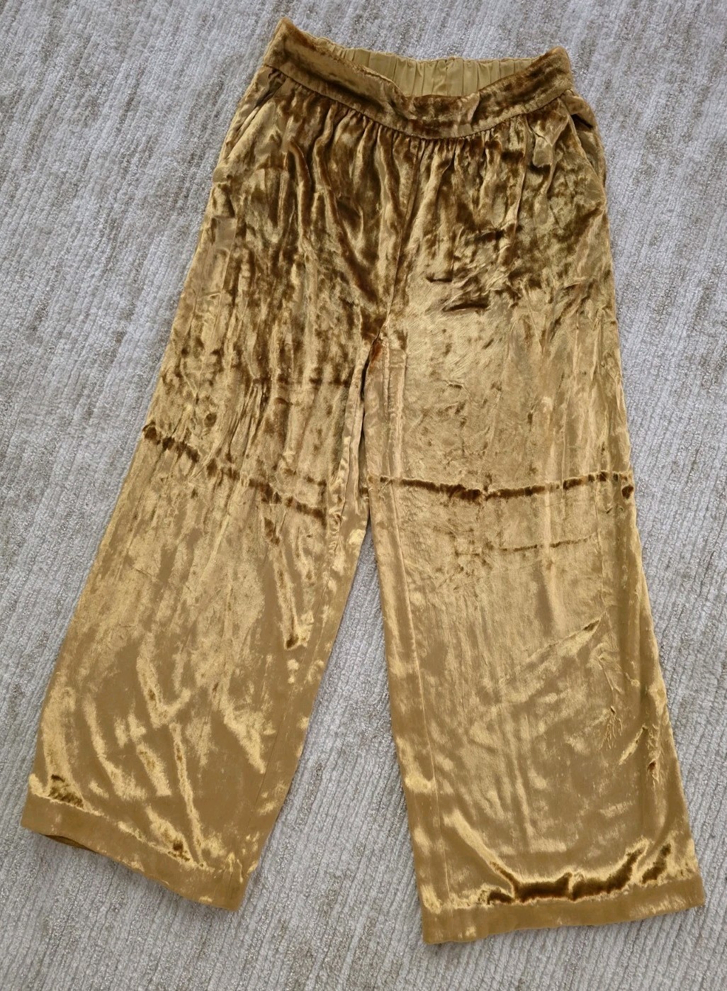 These Maeve Anthropologie velvet wide leg pants in Anastacia size M are a stylish choice for various occasions like travel, parties, casual outings, and business events. The gold mustard color adds a touch of elegance to the pants, while the ruffle accents and wide-leg style make them trendy. With a mid-rise and 30-inch inseam, these pants offer a comfortable fit for the modern woman. Made from a blend of nylon and viscose, these pants are perfect for the winter, fall, and spring seasons, and can be care for with dry cleaning only.
