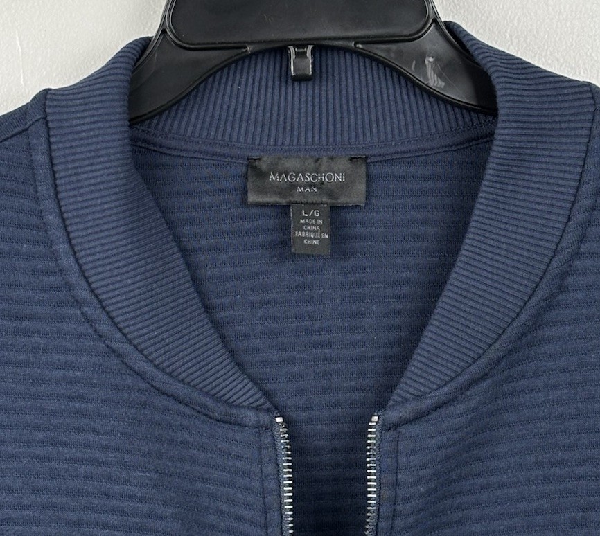 The Magaschoni Men’s Rib Knit Full Zip Jacket in Navy Excellent used condition. Looks new. No stains tears or snags Side pocket with snap closure Like new condition Size large Chest width pit to pit 23” across Length 27” Ships fast via USPS Made from comfortable cotton knit fabric with a ribbed texture, this mid-length jacket features a full zip closure and pockets for added convenience. The navy color and solid pattern make it a classic choice suitable for winter, fall, and spring seasons.