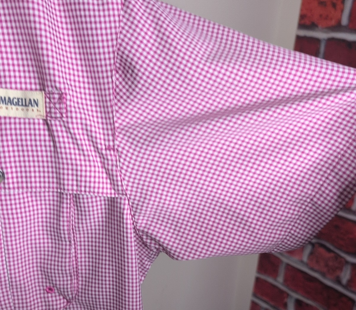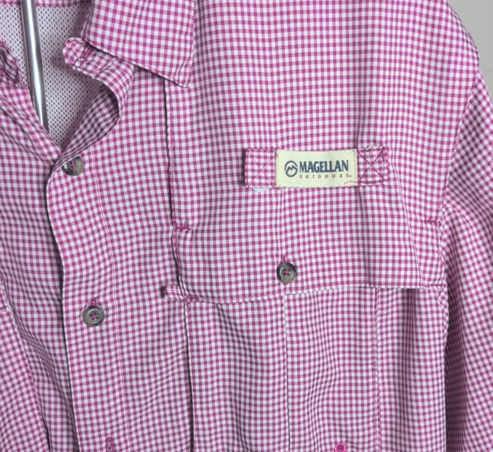 The Magellan Fish Gear Shirt for men in medium size is a blue button-up shirt perfect for casual occasions. Made from polyester fabric, it offers a relaxed fit with moisture-wicking properties, making it ideal for summer, fall, and spring seasons. The shirt features a collared neckline and short sleeves, with a solid pattern and fisherman character theme. With a button-down collar style and easy care instructions, this shirt is both stylish and practical for outdoor activities. great looking shirt! see the photos.